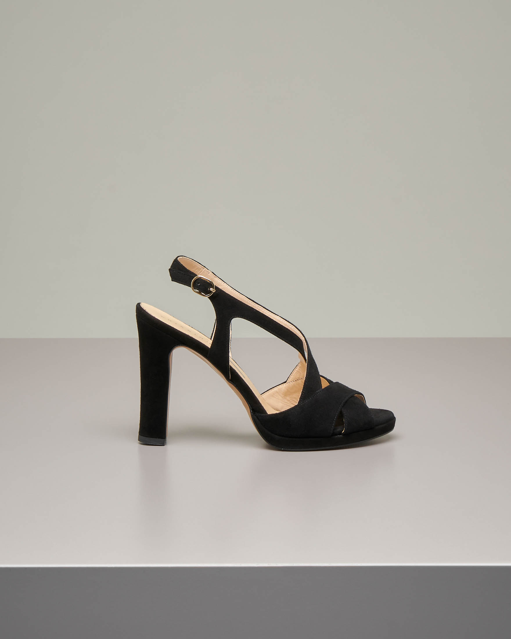 Sandalo in camoscio nero con tacco alto e fascette intrecciate
