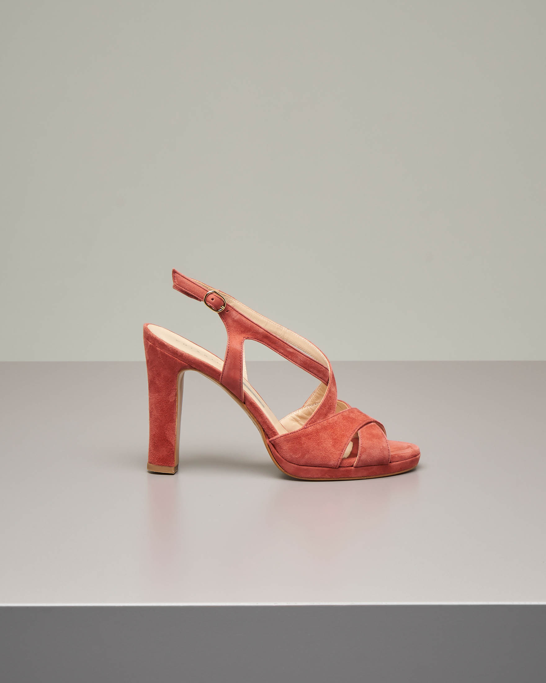 Sandalo in camoscio color mattone con tacco alto e fascette intrecciate
