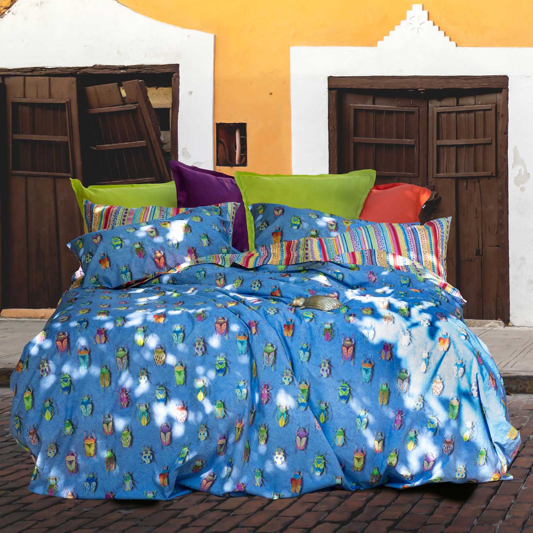 Copripiumino Beetles Izylinen double face a una piazza in cotone azzurro a stampa scarabei e righe multicolore