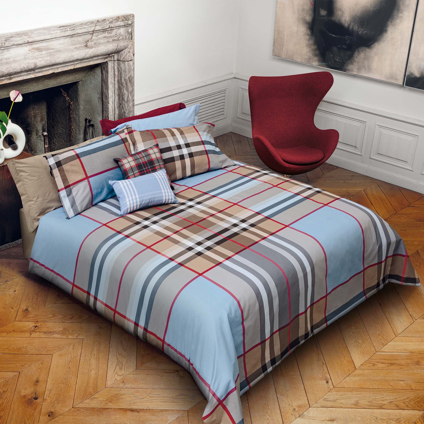 Copriletto trapuntato a una piazza e mezza a fantasia tartan azzurro e beige