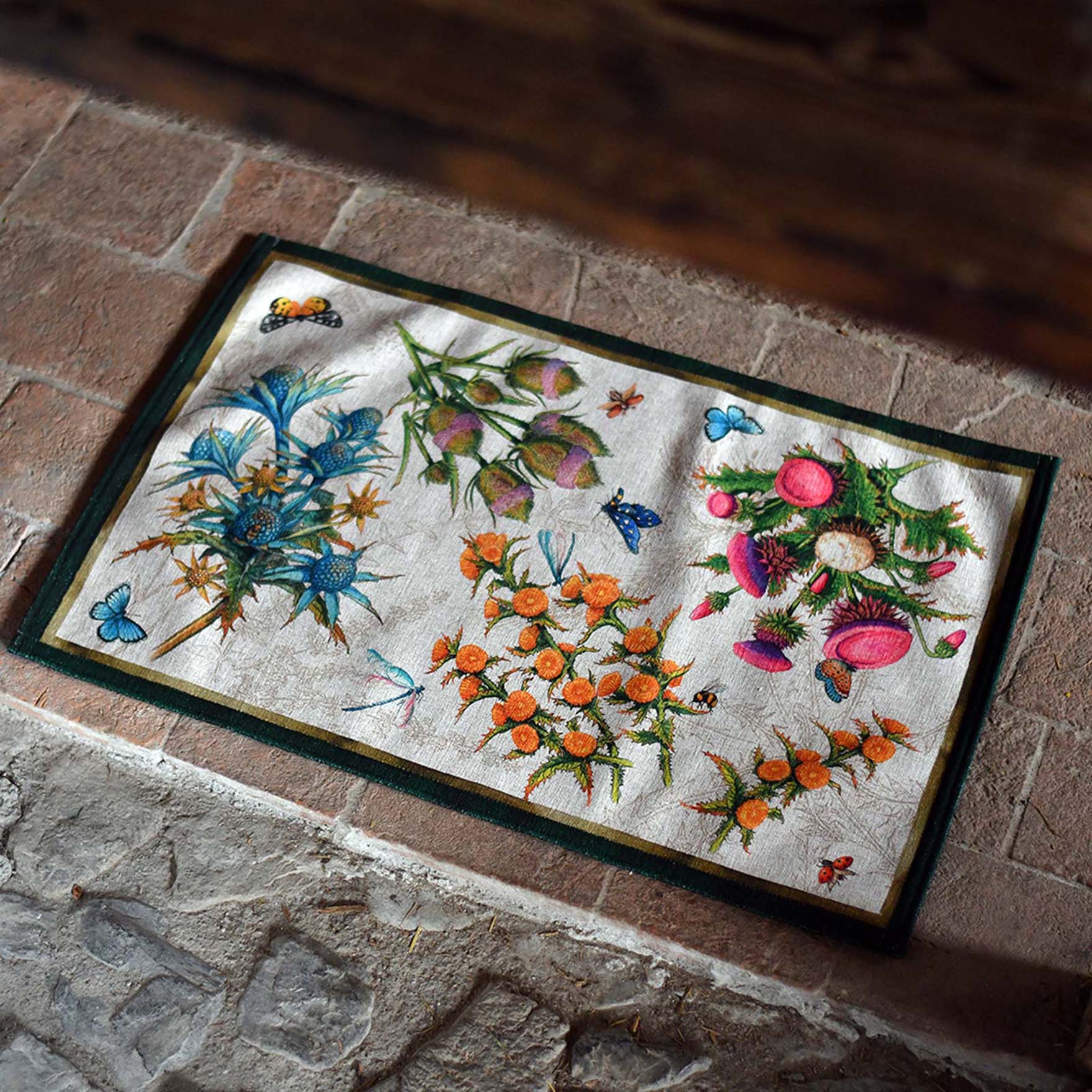 Tappeto avorio 52x180cm in materiale riciclato a stampa fiori di carciofo bluette arnacioni e fucsia