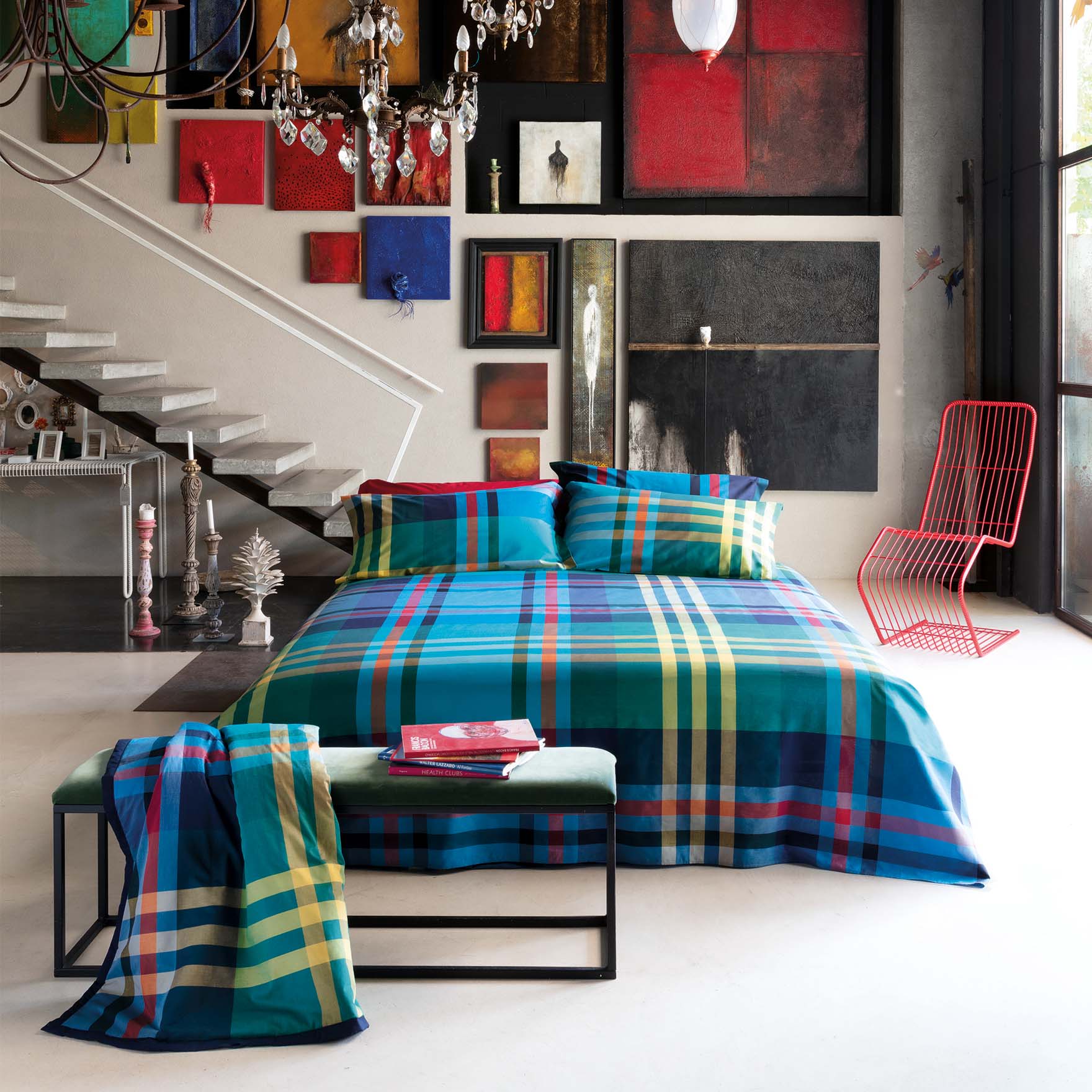 Copripiumino a due piazze a fantasia tartan blu royal a righe multicolore