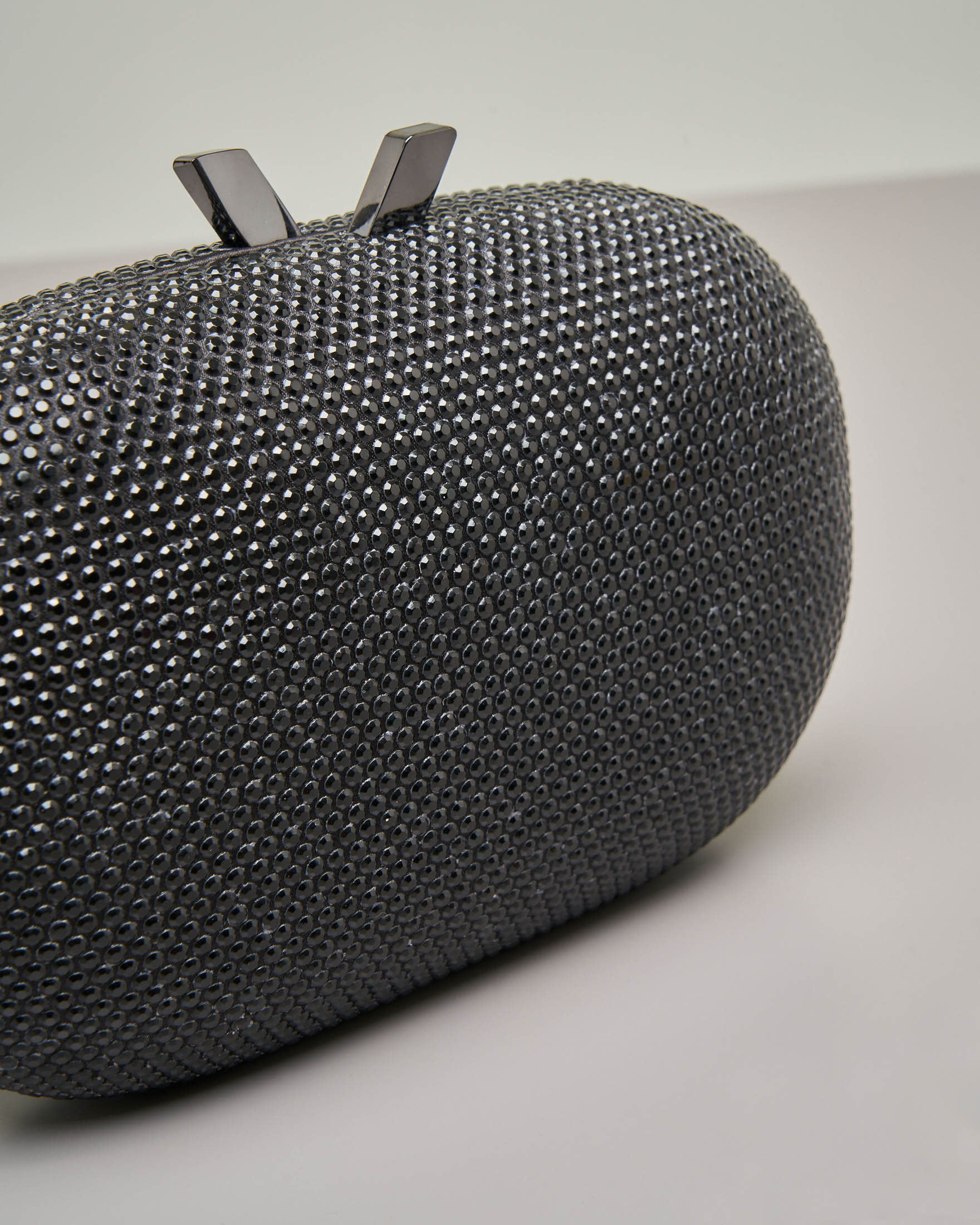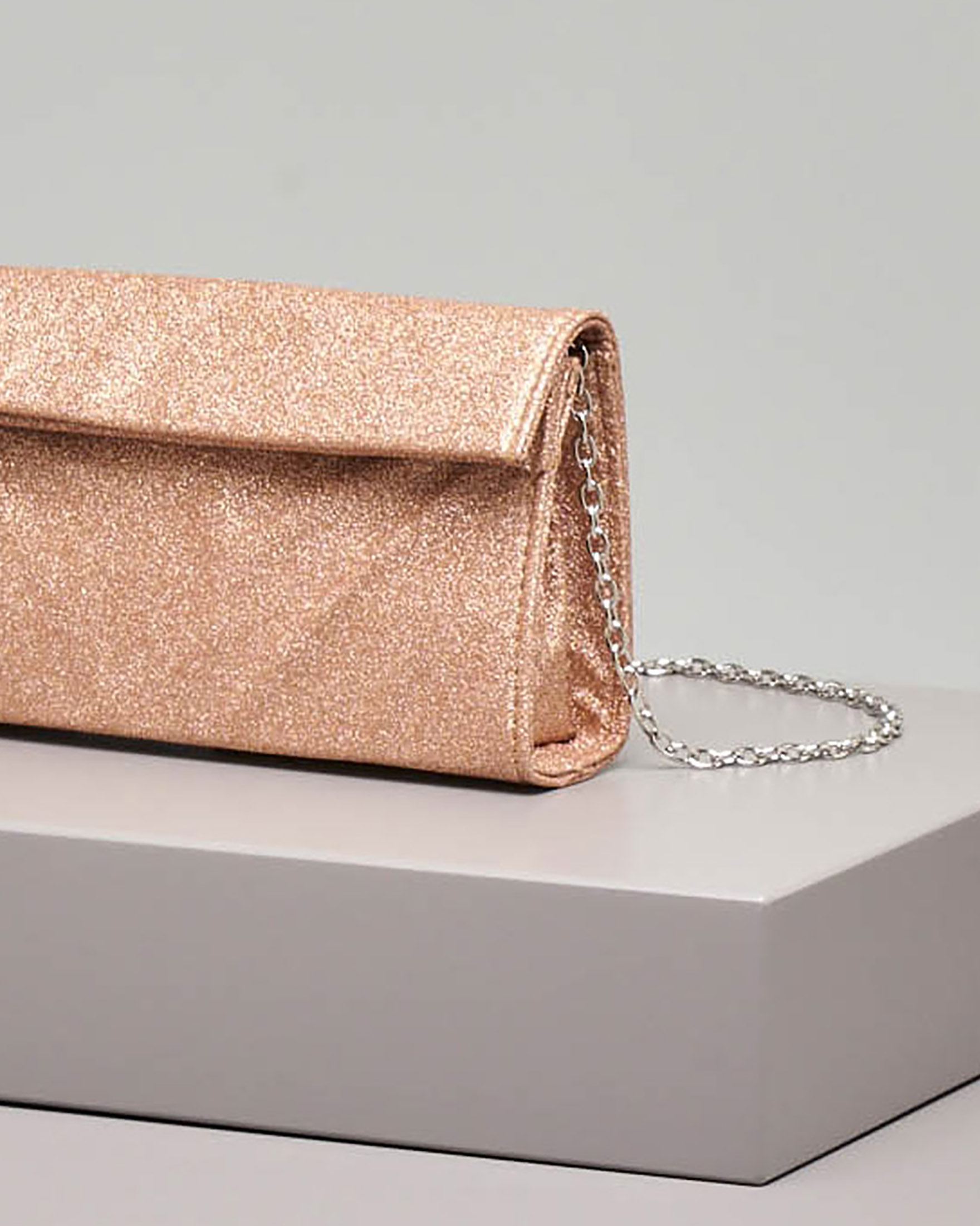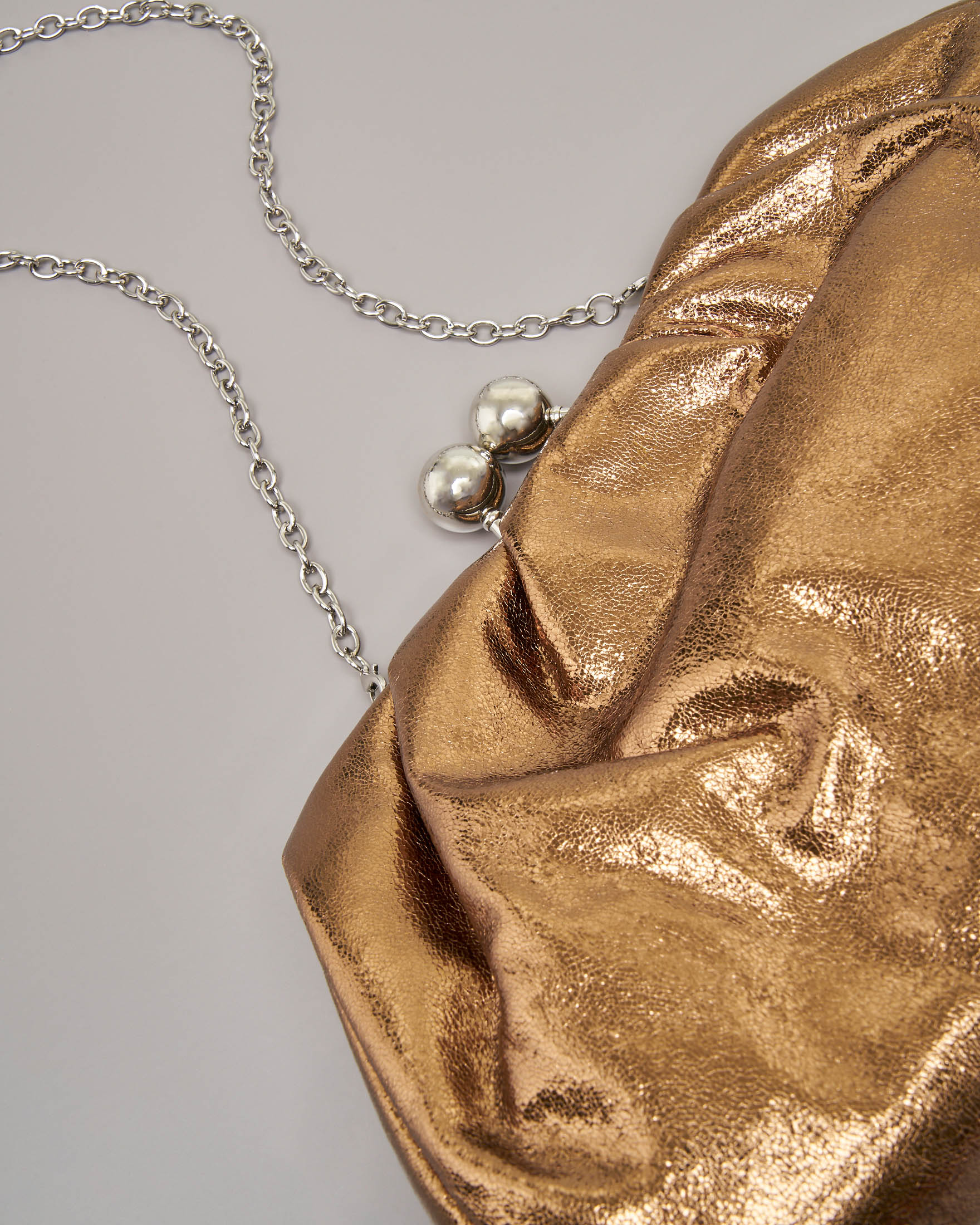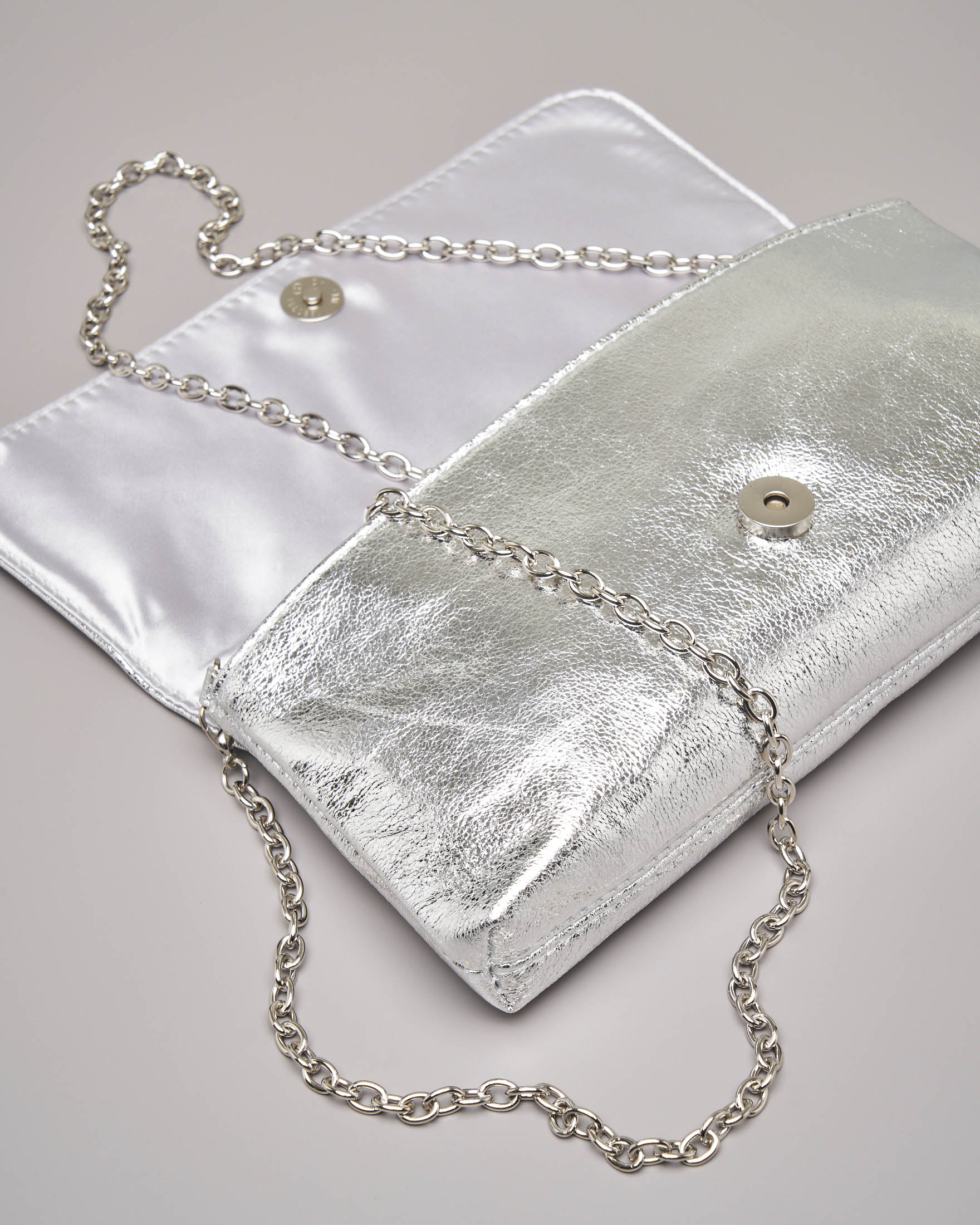 Pochette lunga modello a busta con patella con chiusura a doppio bottone a calamita a scomparsa. Fodera interna tono su tono. Taschina interna con chiusura a cerniera. Tracolla in metallo removibile con gancetti.