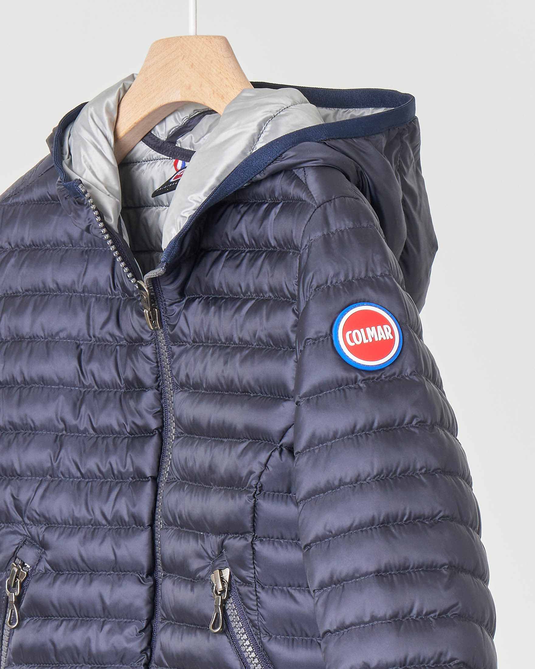 Piumino con cappuccio fisso imbottito in 90% piumino e 10% piuma d'anatra, chiusura con zip, due tasche con cerniera, interno in contrasto colore. Nastro elastico sul fondo e sulle maniche e logo bollo "Colmar Originals" applicato sulla manica sinistra, logo bollo piccolo sul retro.