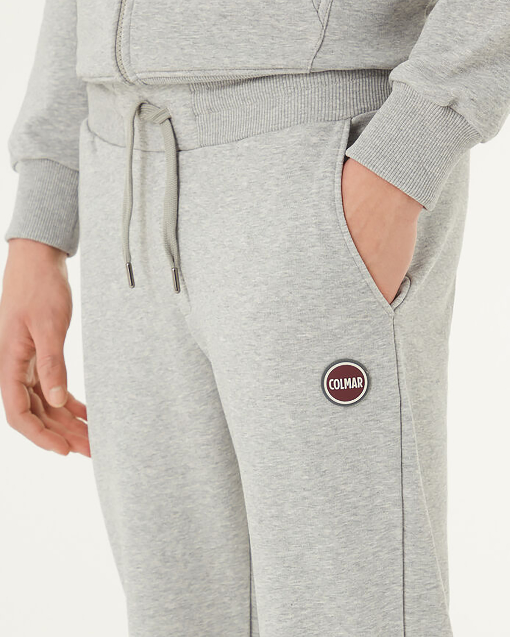Pantalone in felpa di cotone con coulisse in vita e polsini a costine elastiche al fondo. Tasche alla fancese davanti e applicata sul retro. Patch logo bollo applicato sul fianco sinistro.