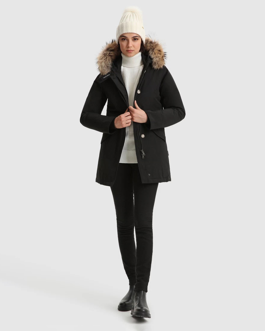 Arctic Parka Woolrich nero slim fit imbottito in piuma naturale con bordatura in pelliccia