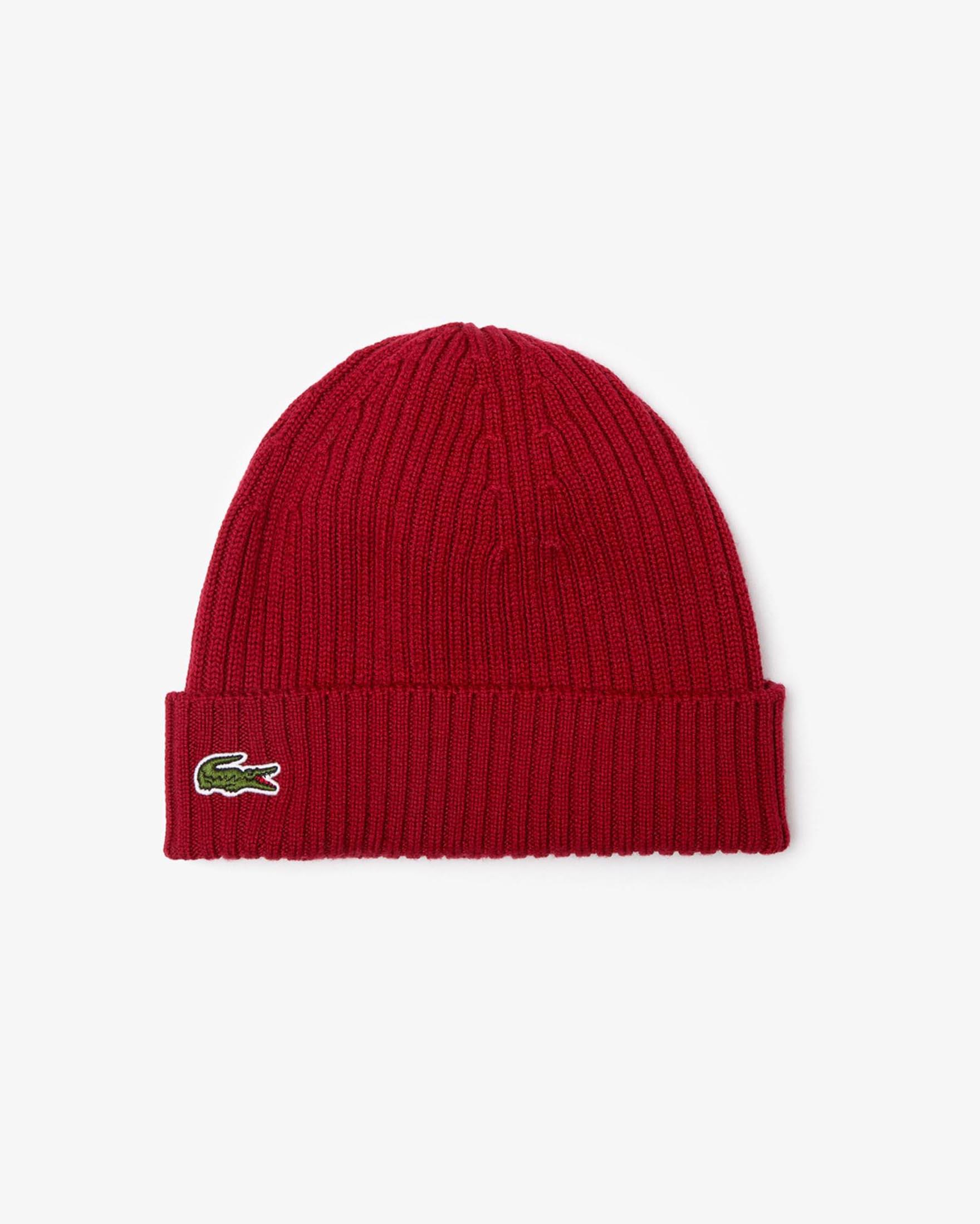 Berretto bordeaux in lana a coste con logo coccodrillo verde -20%