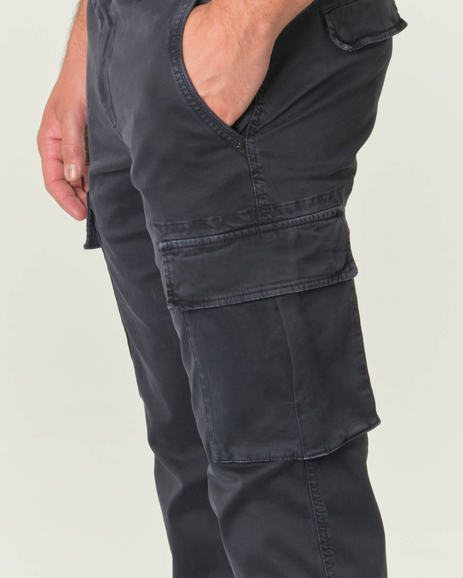 Pantaloni cargo in gabardina di cotone stretch. Tasche alla francese davanti, con patta e bottoni dietro. Patch porta logo applicato sul retro e chiusura con cerniera nascosta e bottone.
