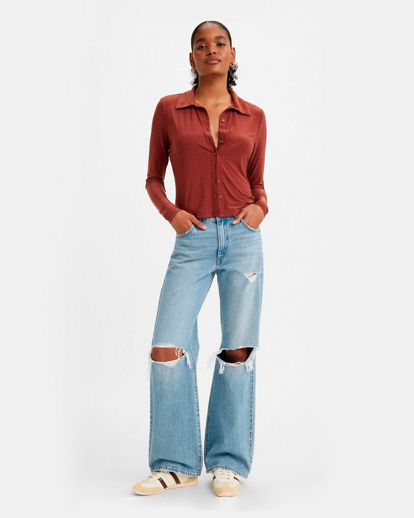 Jeans bootcut a vita alta in puro cotone lavaggio chiaro con strappi alle ginocchia
