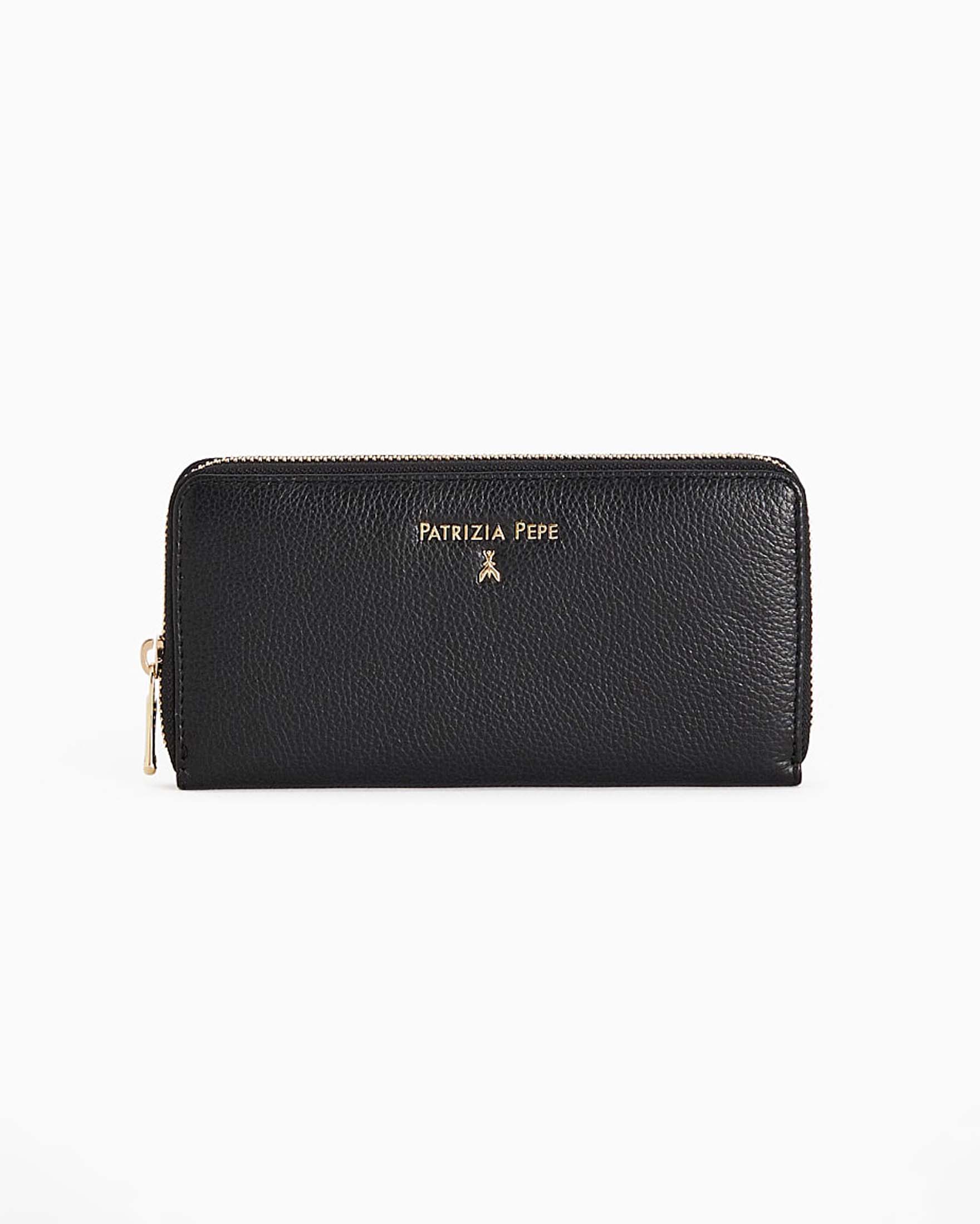 Portafoglio in pelle effetto martellato con scritta logo in metallo e chiusura a cerniera. Tasca interna per monete e slot per banconote e carte di credito. Dettagli in galvanica dorata. Misure 19 x 10 x 2 cm.