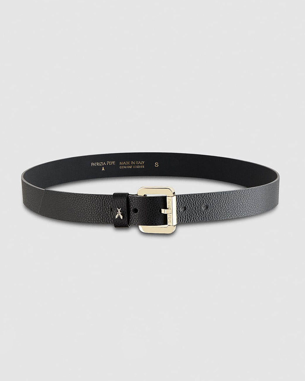 Cintura nera in pelle Patrizia Pepe con fibbia dorata con scritta logo impressa e Fly applicata sul davanti