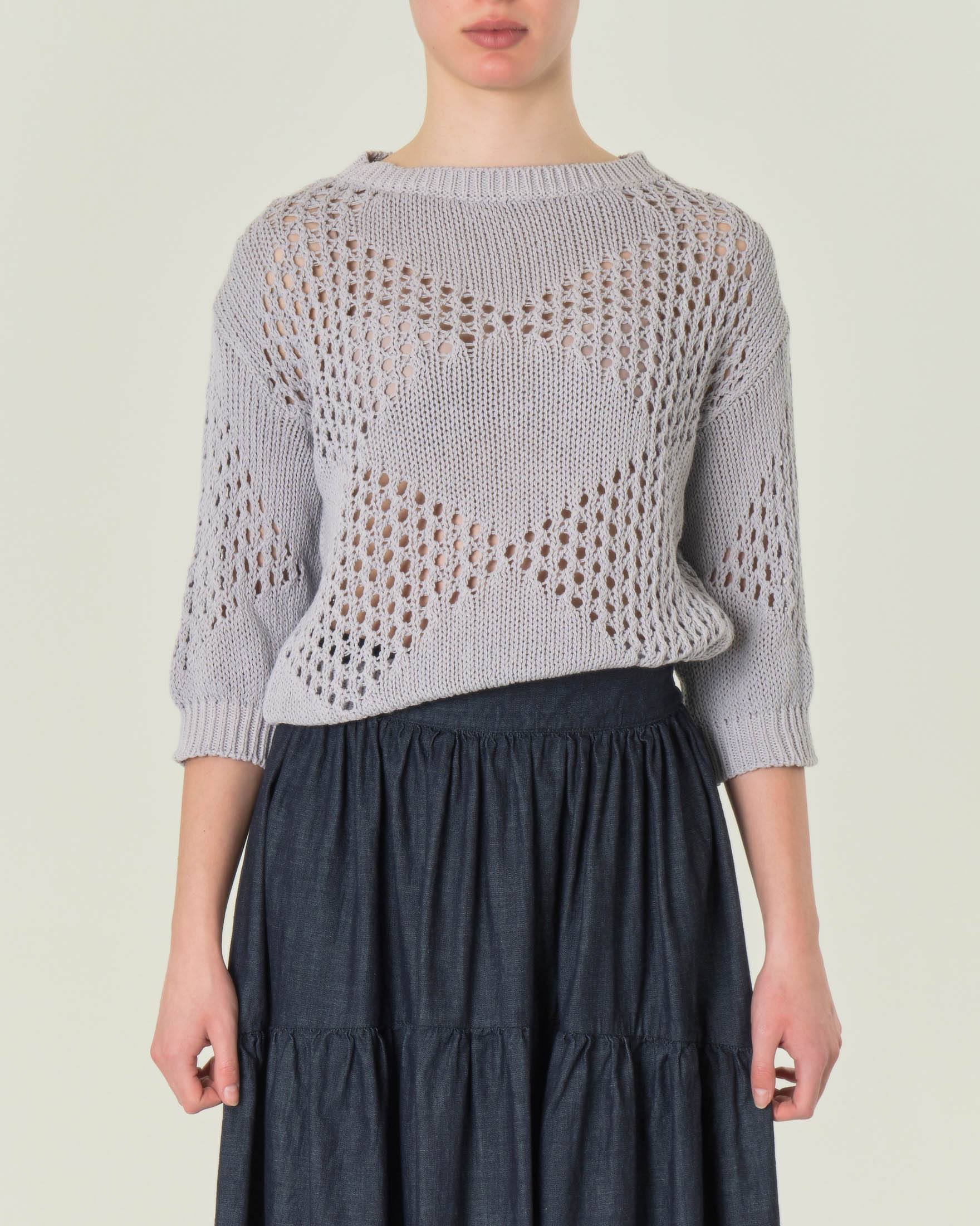 Maglia grigia cropped in puro cotone a rombi lavorati a punto rete con maniche a tre quarti -50%