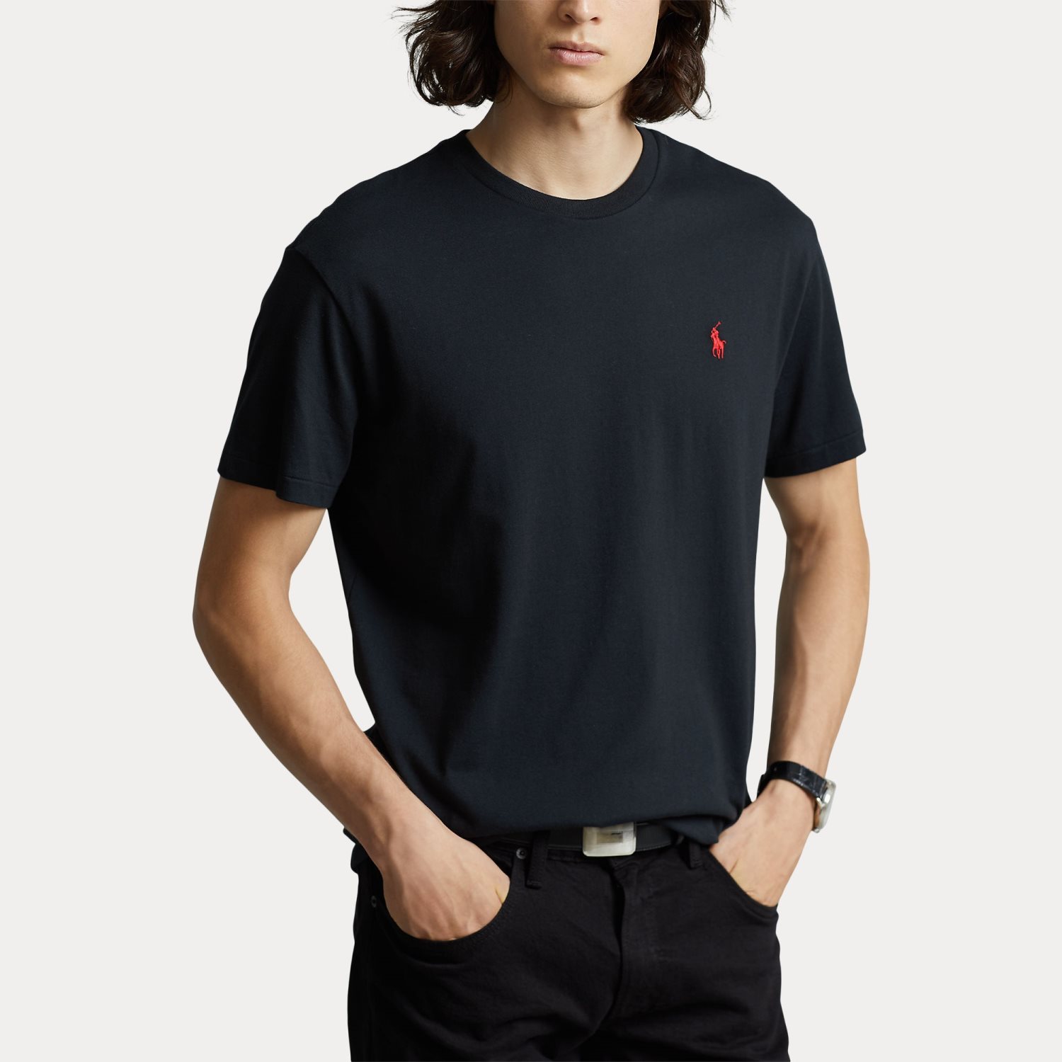 T-shirt nera mezza manica custom slim-fit con logo pony rosso