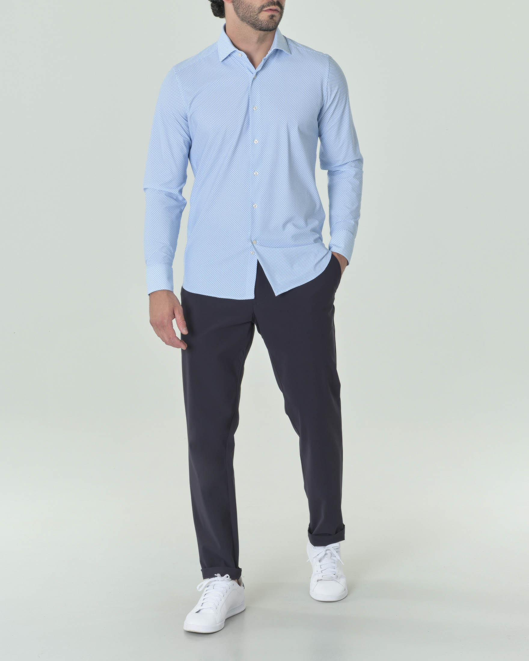 Camicia azzurra in tessuto tecnico hyper comfort con microfantasia a rombi