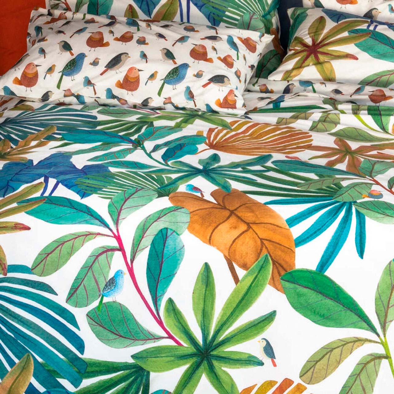 Copripiumino ad una piazza double-face Mindo in cotone con stampa felci ed uccellini
