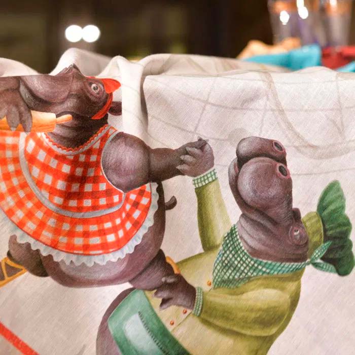 Tovaglia rettangolare Figaro in lino a fantasia ippopotami ballerini 160x230