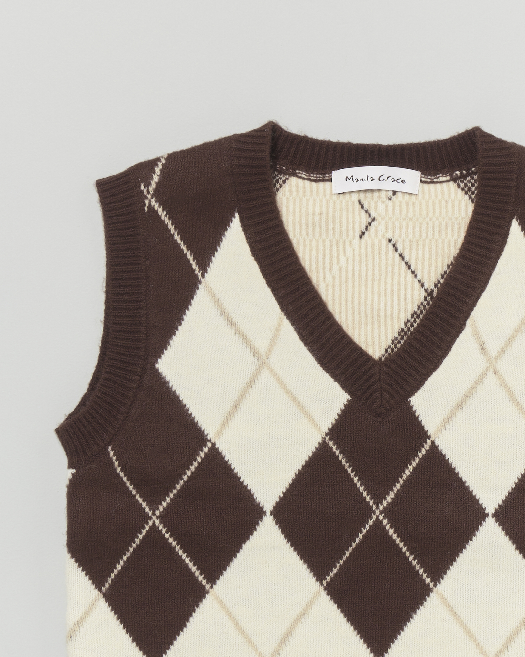 Gilet Manila Grace in maglia a rombi marroni e panna