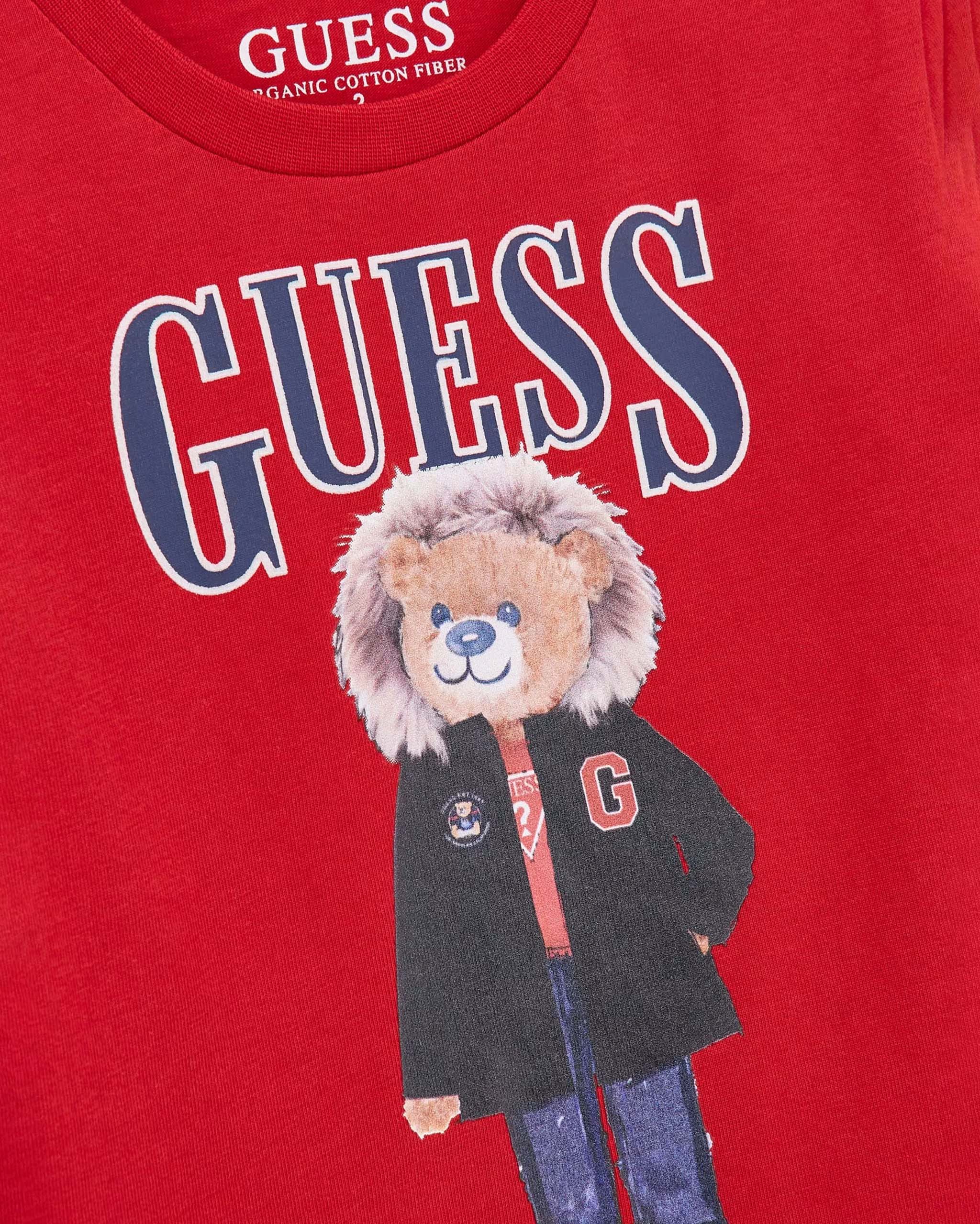 T-shirt rossa Guess a maniche lunghe con stampa orsetto e maxi scritta logo