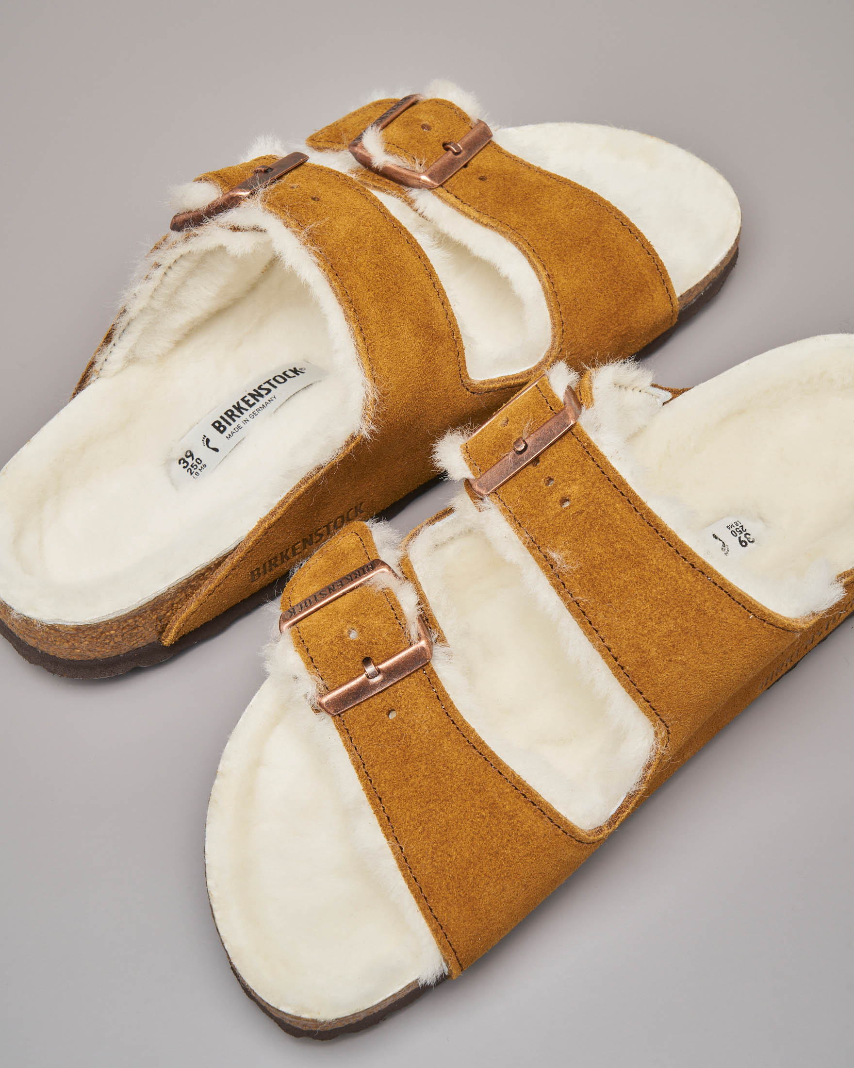 Sandalo Arizona color cuoio in pelle scamosciata con interno in shearling a contrasto