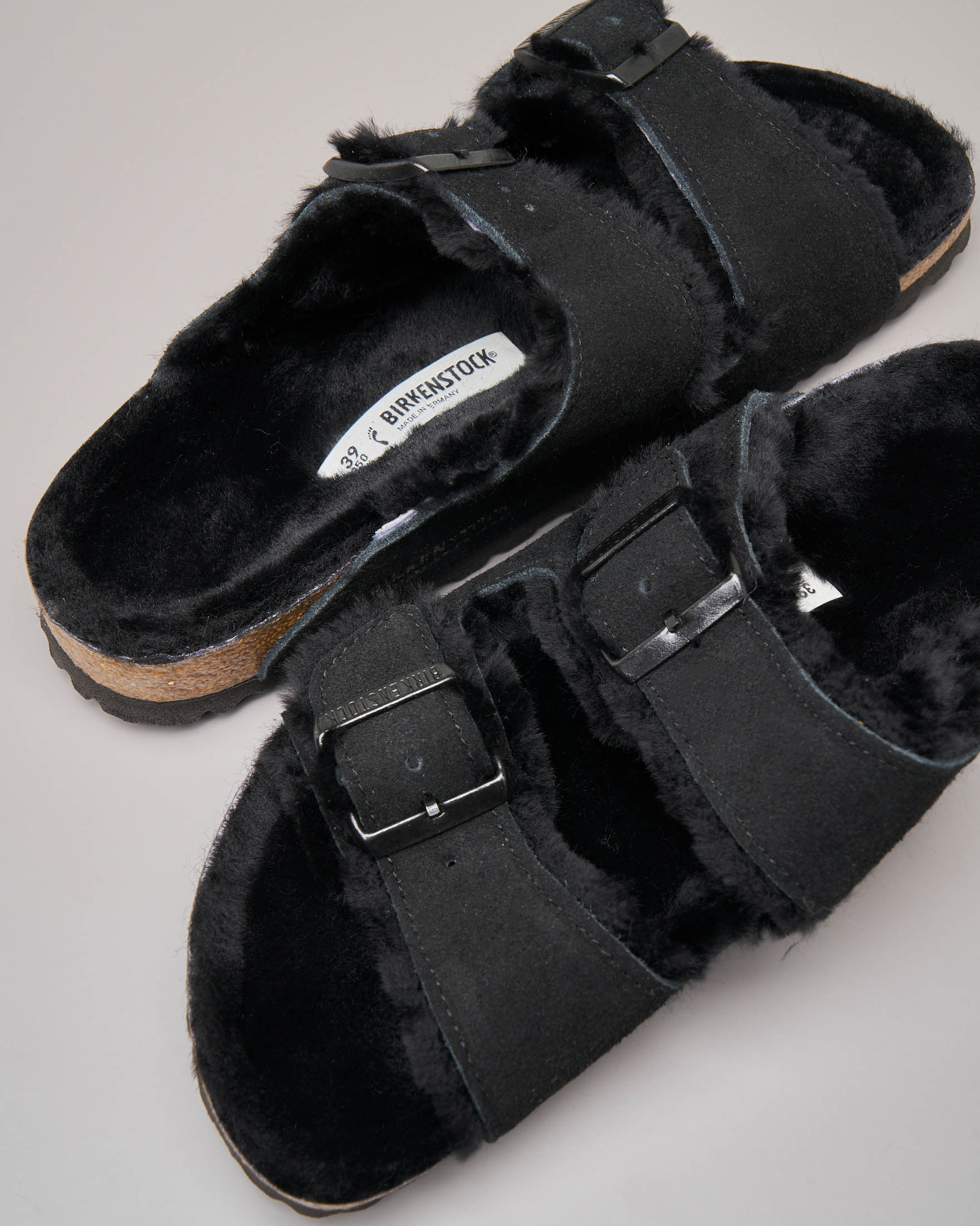 Sandalo Arizona nero in pelle scamosciata con interno in shearling tono su tono