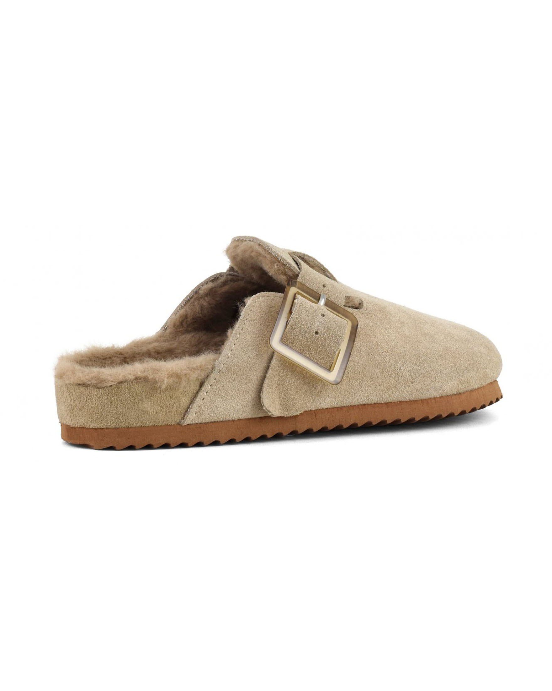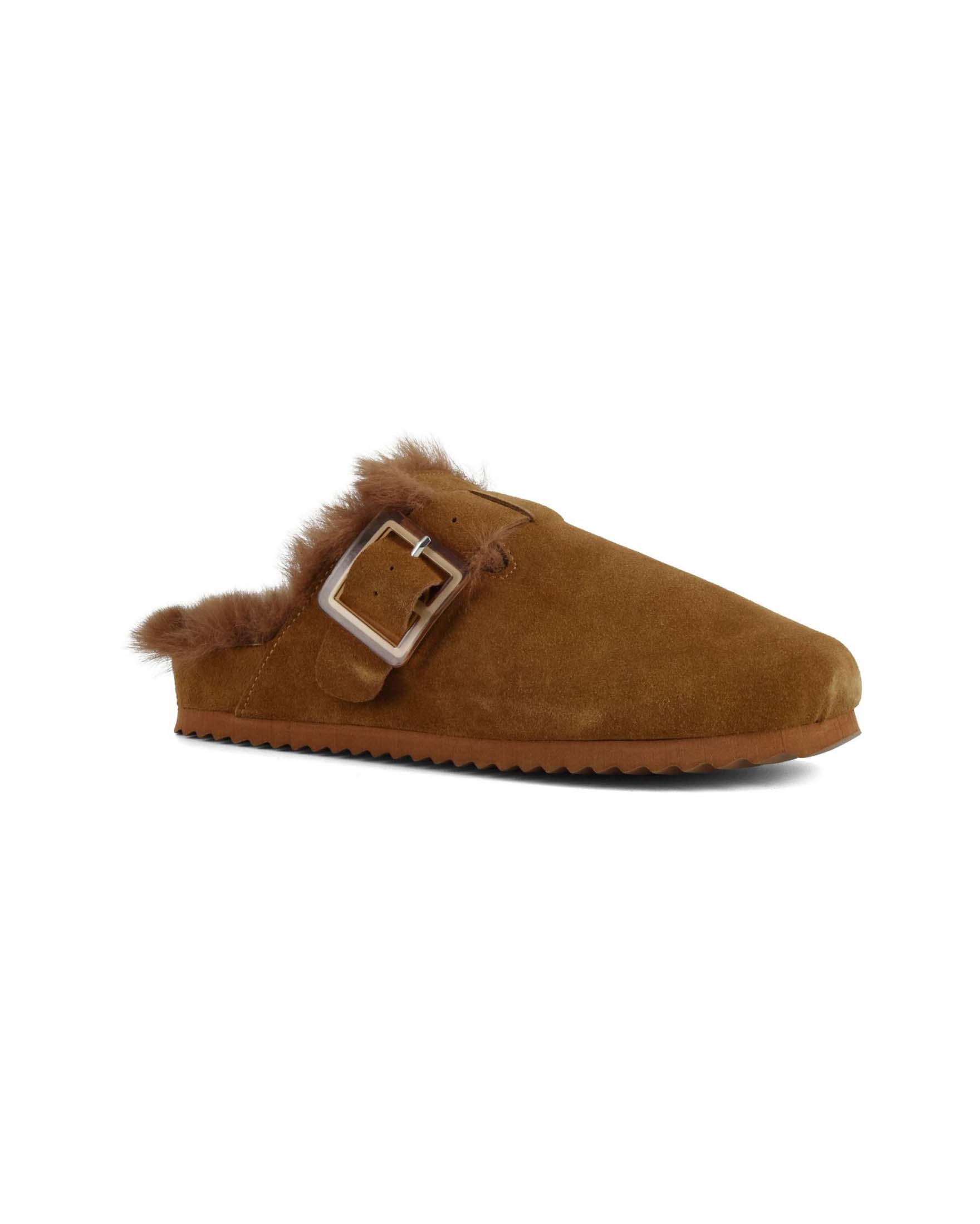 Sabot color cognac in pelle scamosciata con fodera effetto pelliccia e fibbia di chiusura laterale