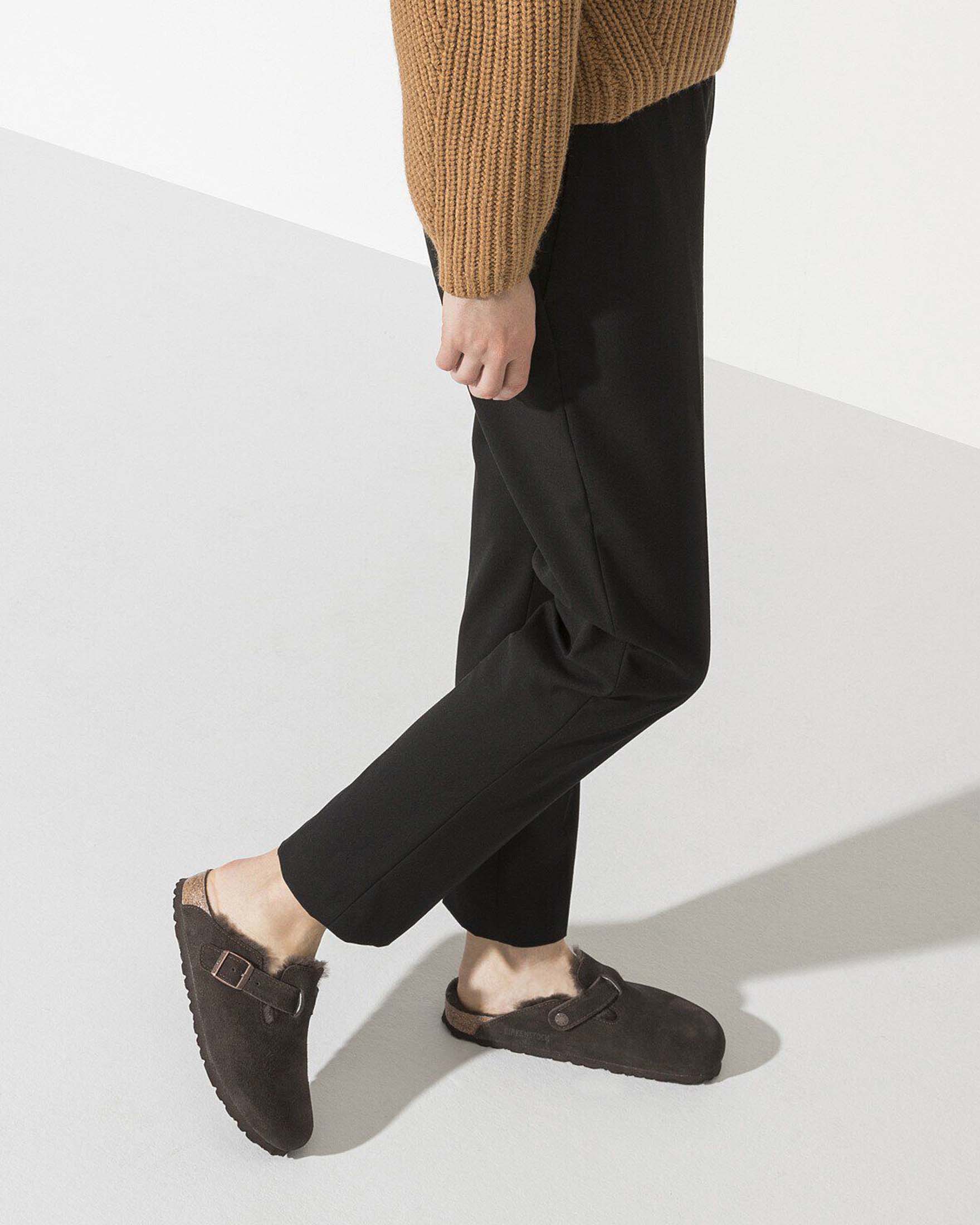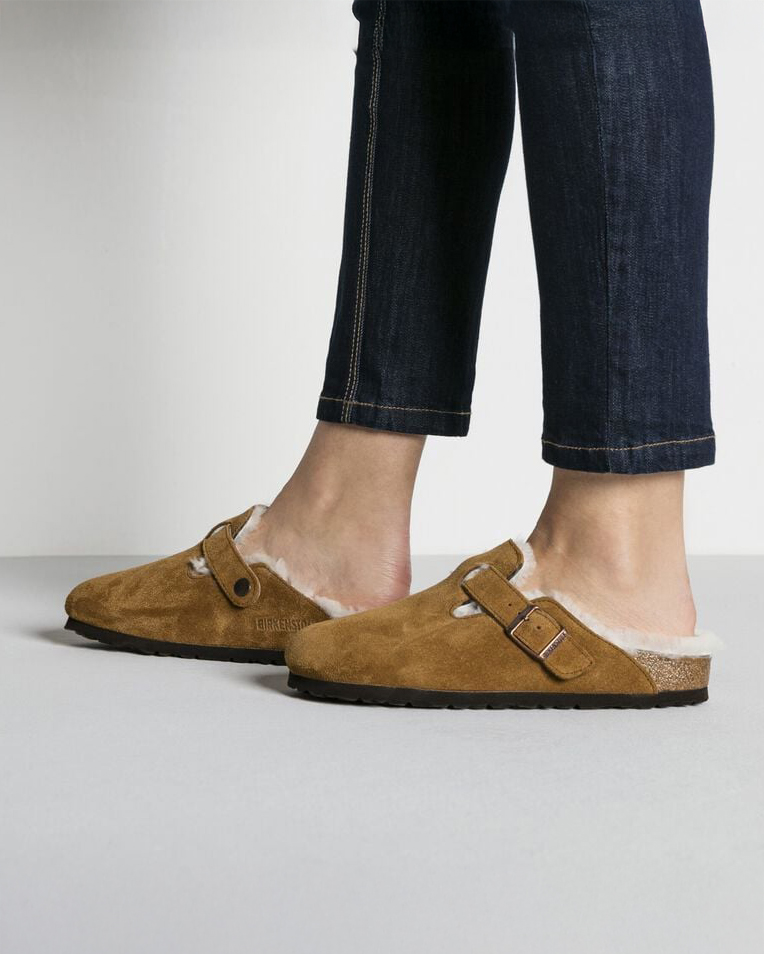 Sandalo Boston Birkenstock in pelle scamosciata marrone con inserto in pelliccia di agnello