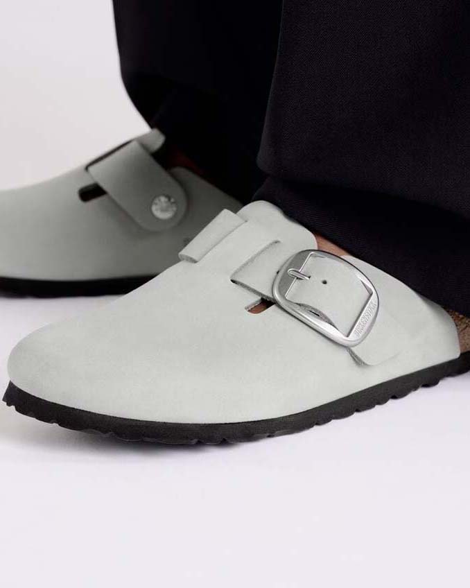 Sabot Birkenstock Big Buckle color salvia in pelle nabuk con fibbia in metallo