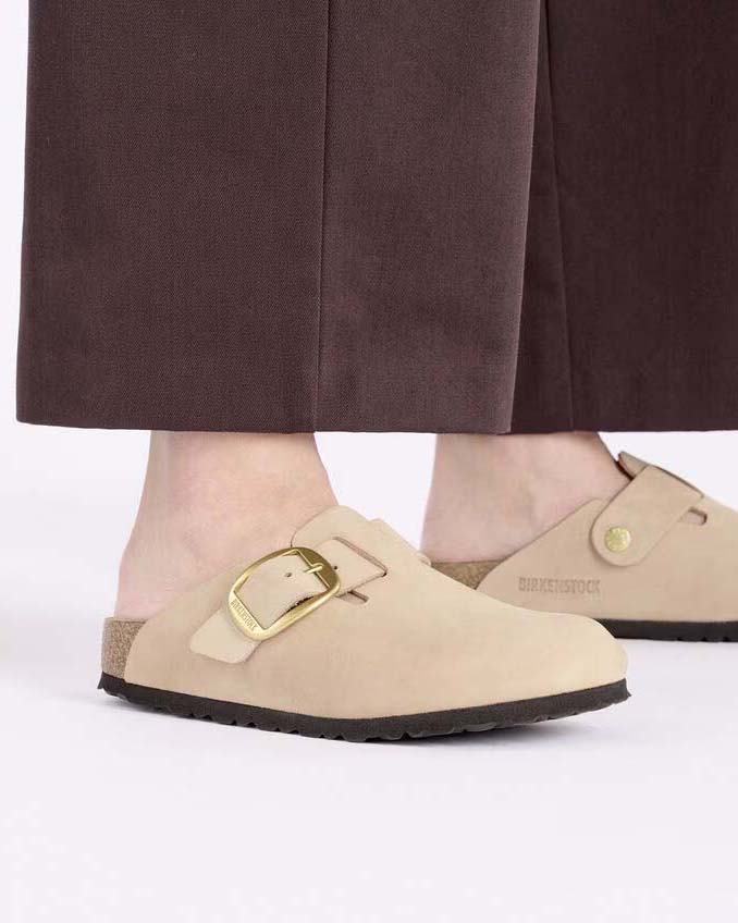 Sabot Birkenstock Big Buckle color sabbia in pelle nabuk con fibbia in metallo