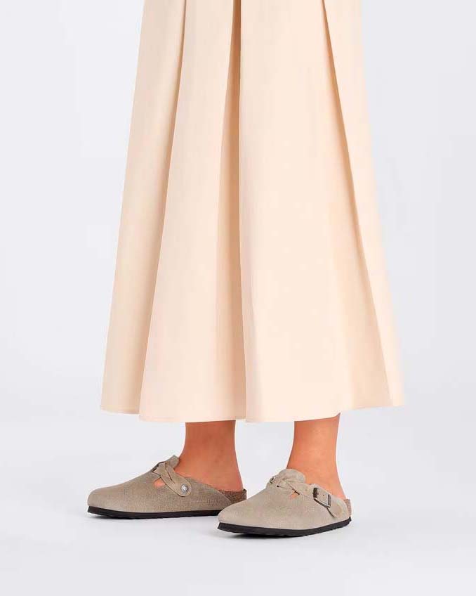 Sabot Boston Bikenstock in pelle scamosciata color taupe con fascetta laterale intrecciata e fibbia ...