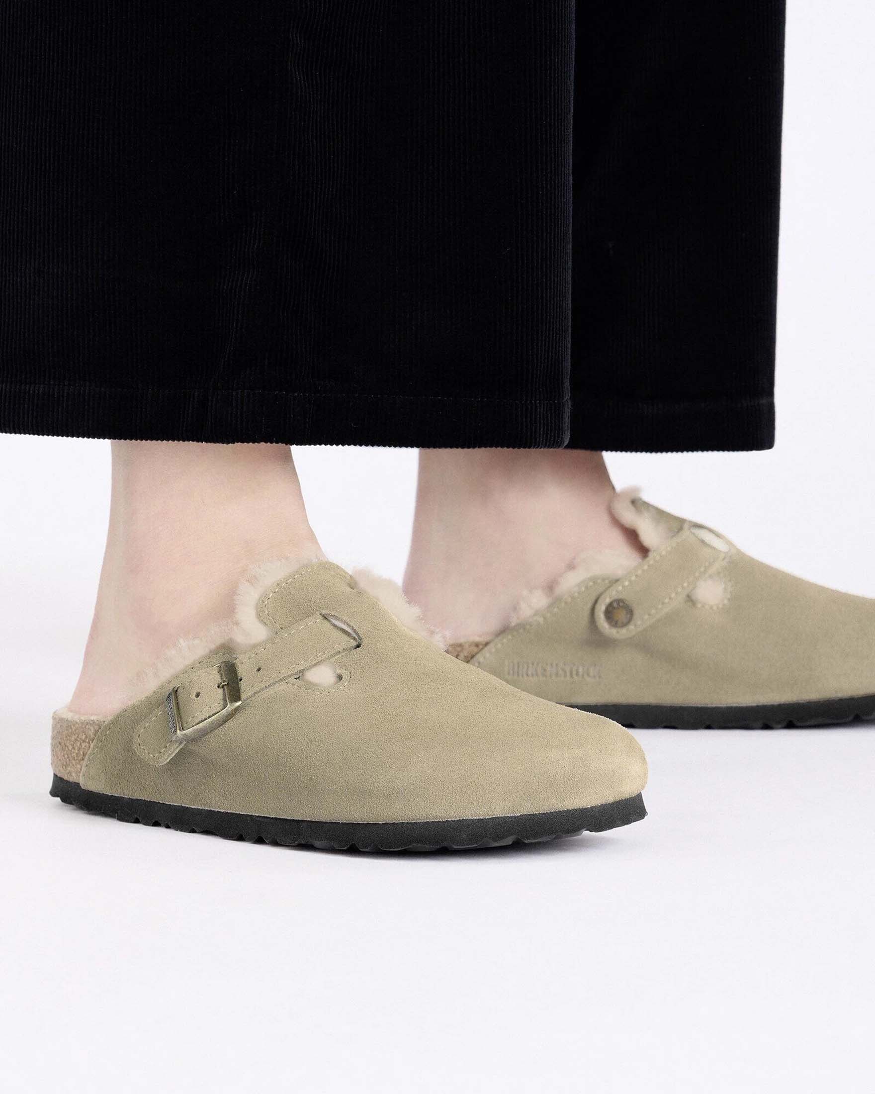 Sandalo Boston Birkenstock in pelle scamosciata color taupe con inserto in pelliccia di agnello