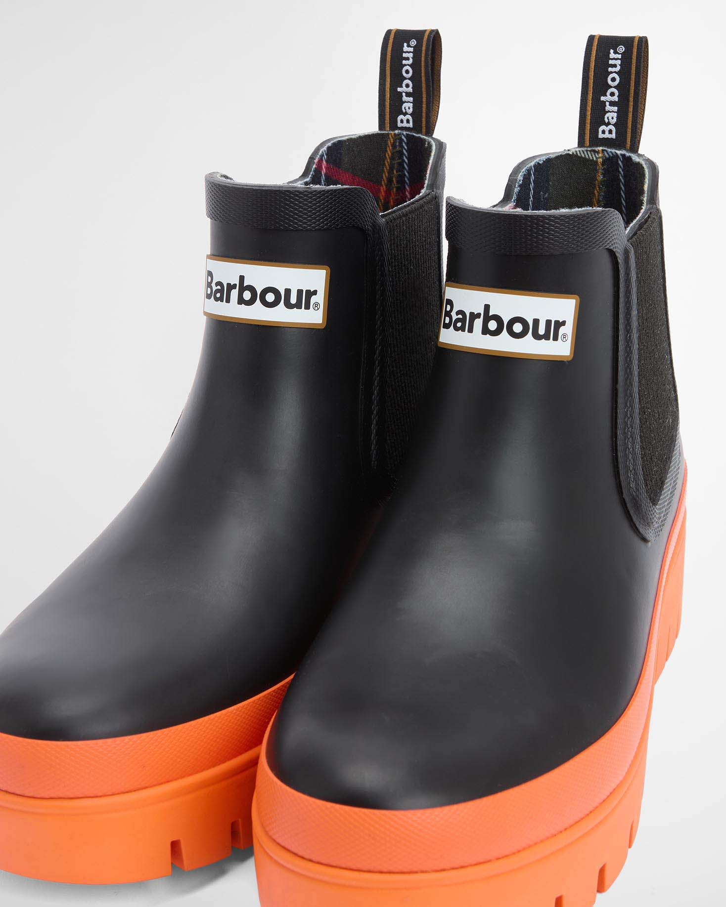 Stivaletti neri in gomma modello Halton Barbour con suola alta in gomma a carrarmato arancione