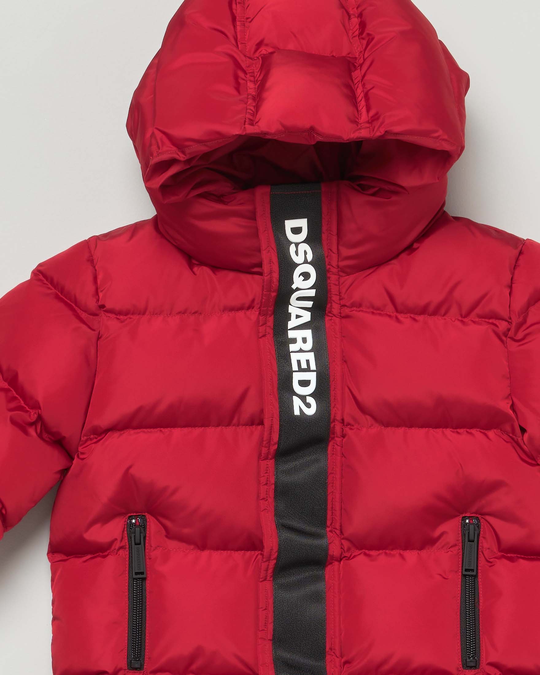 Piumino Dsquared2 rosso trapuntato con cappuccio e banda logo nera