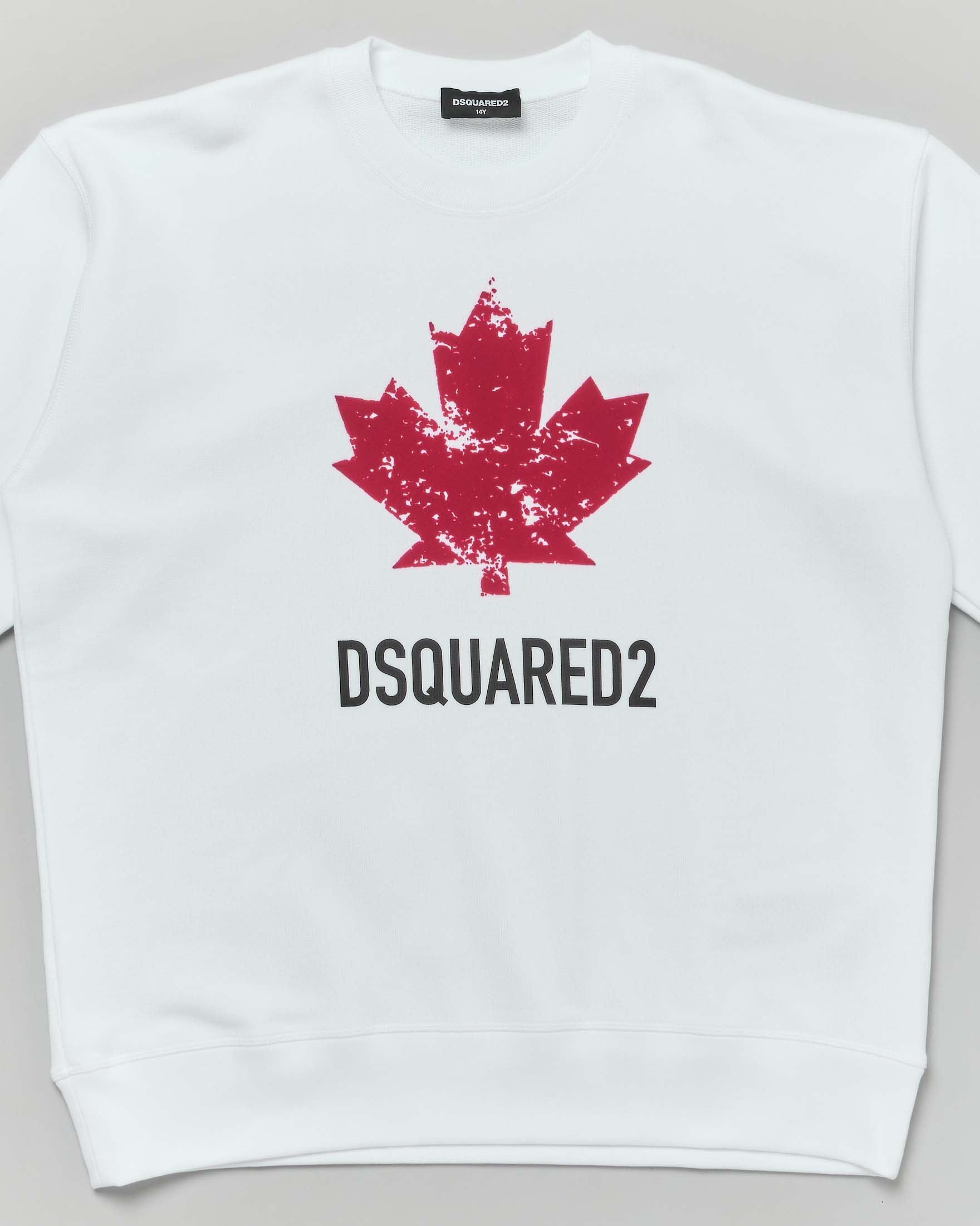 Felpa girocollo Dsquared2 bianca in puro cotone con maxi foglia logo