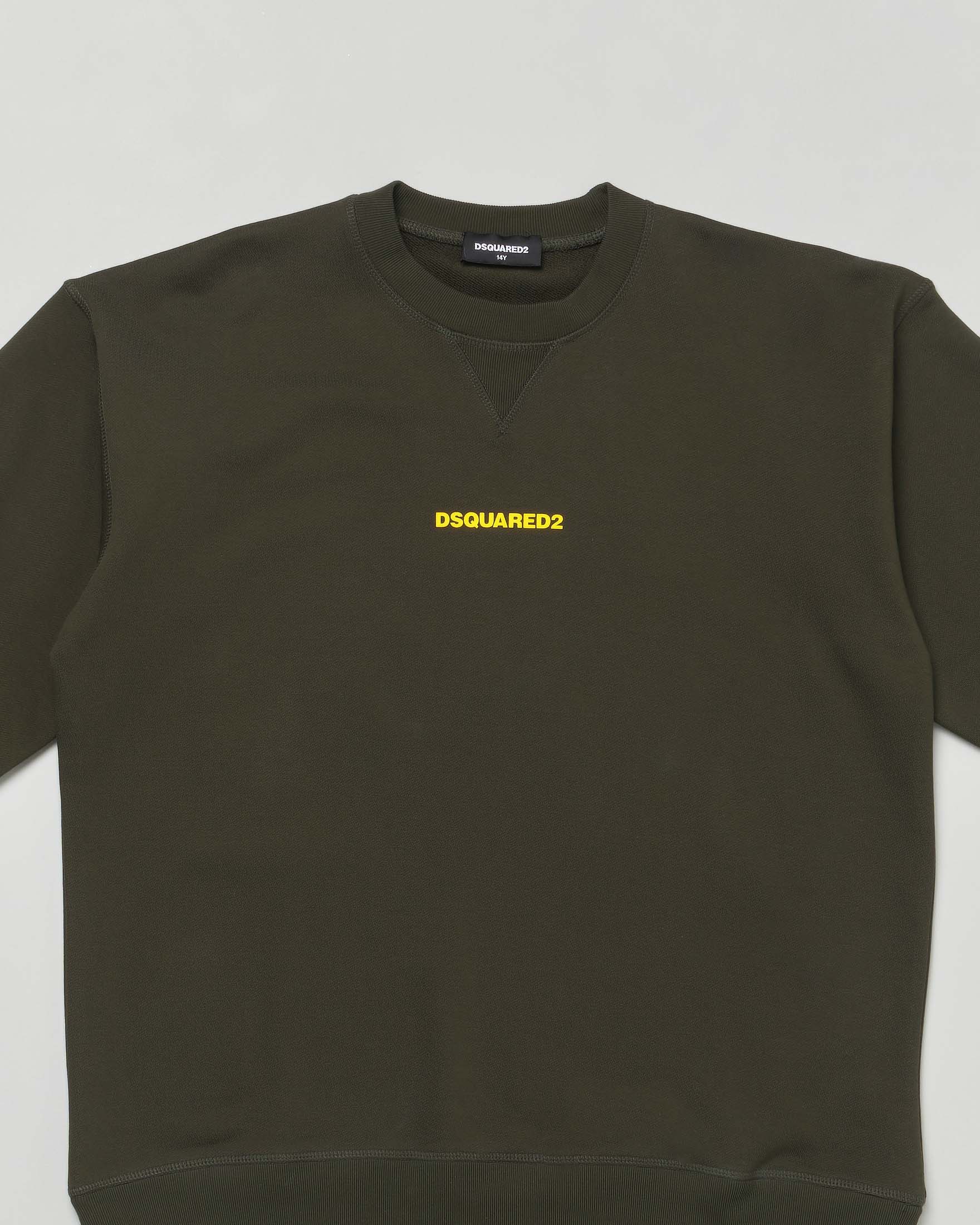 Felpa girocollo Dsquared2 verde militare in puro cotone con mini logo giallo