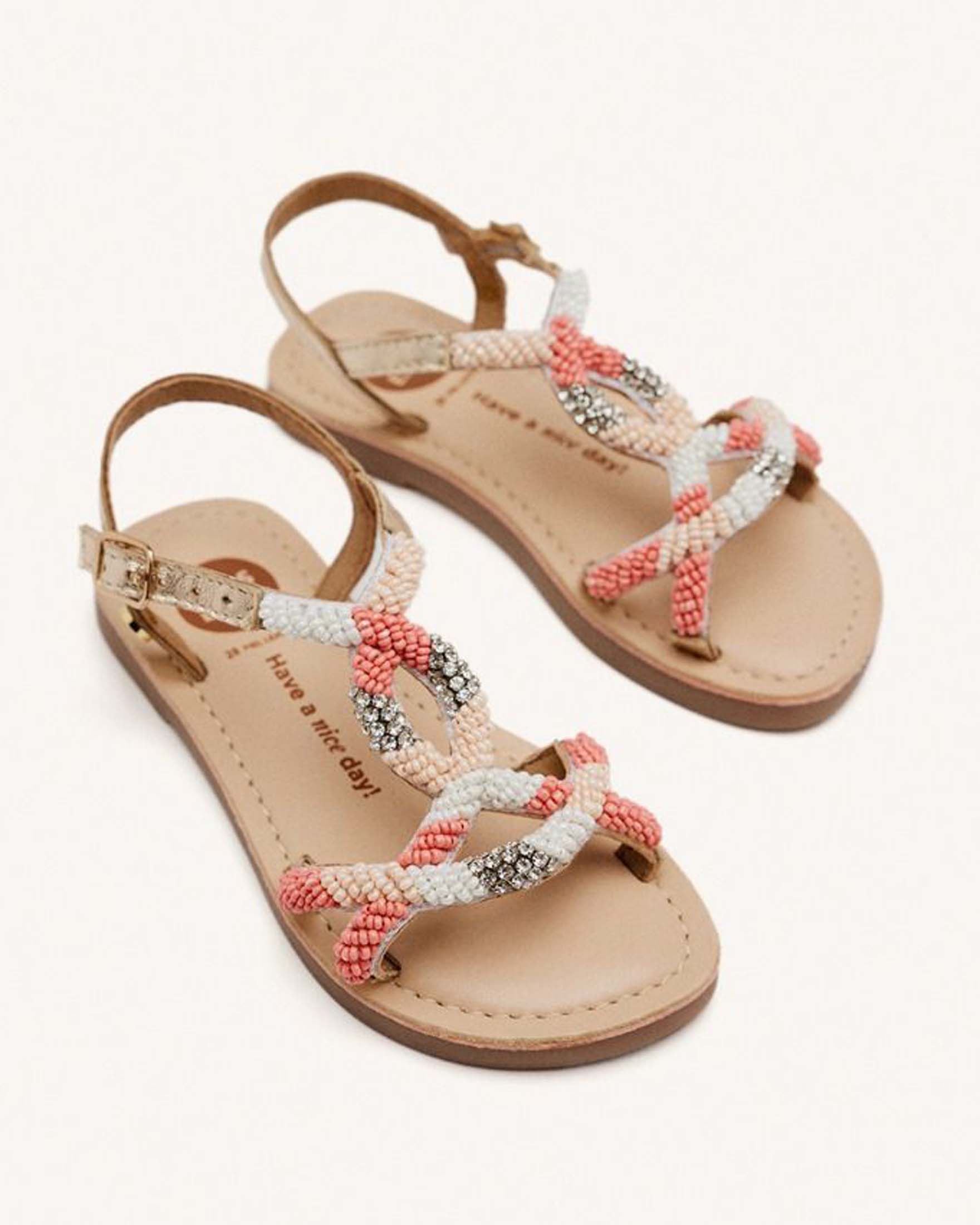 Sandalo in pelle rivestito di perline rosa argento e bianche intrecciate