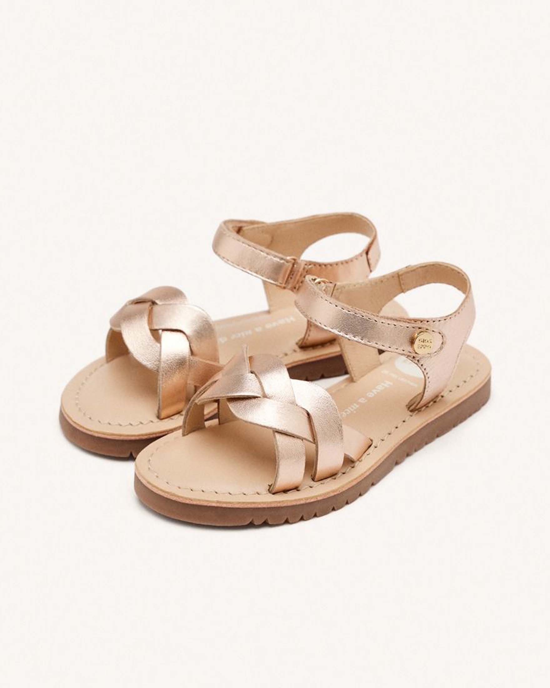 Sandalo oro rosa con fascia a treccia in pelle