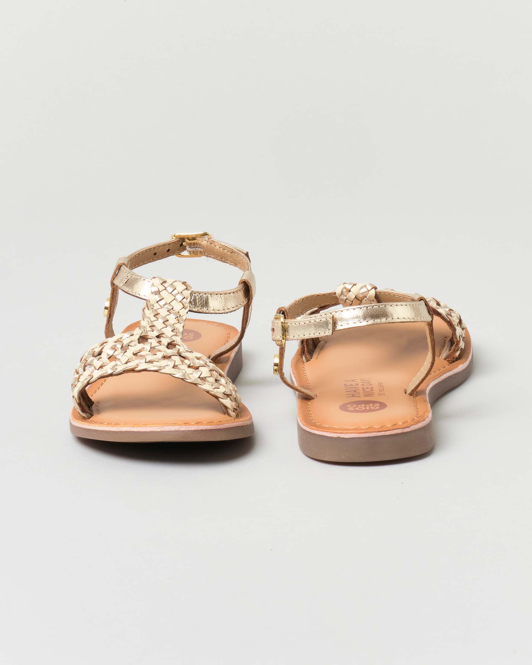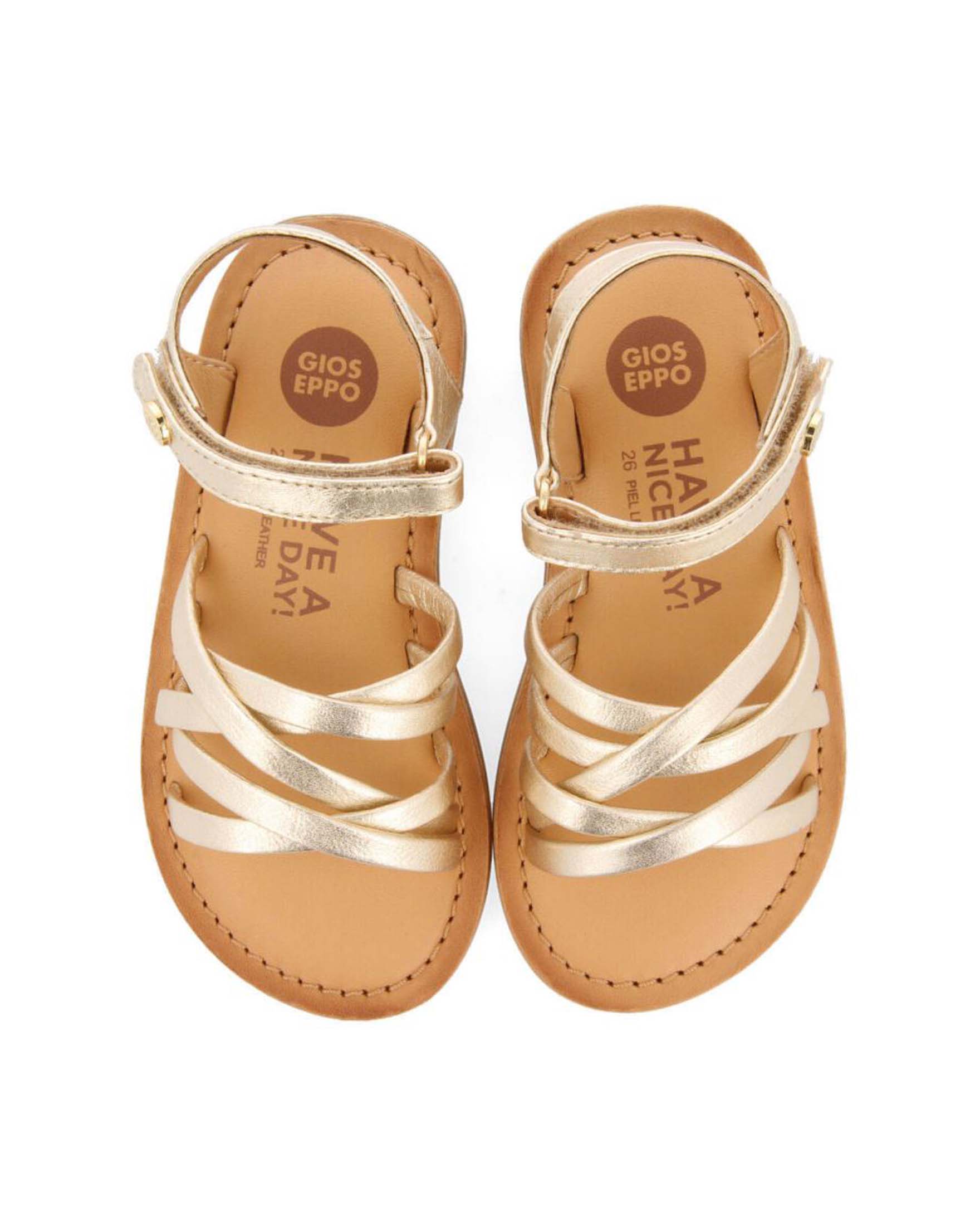 Sandalo in pelle color oro laminato con fascette intrecciate