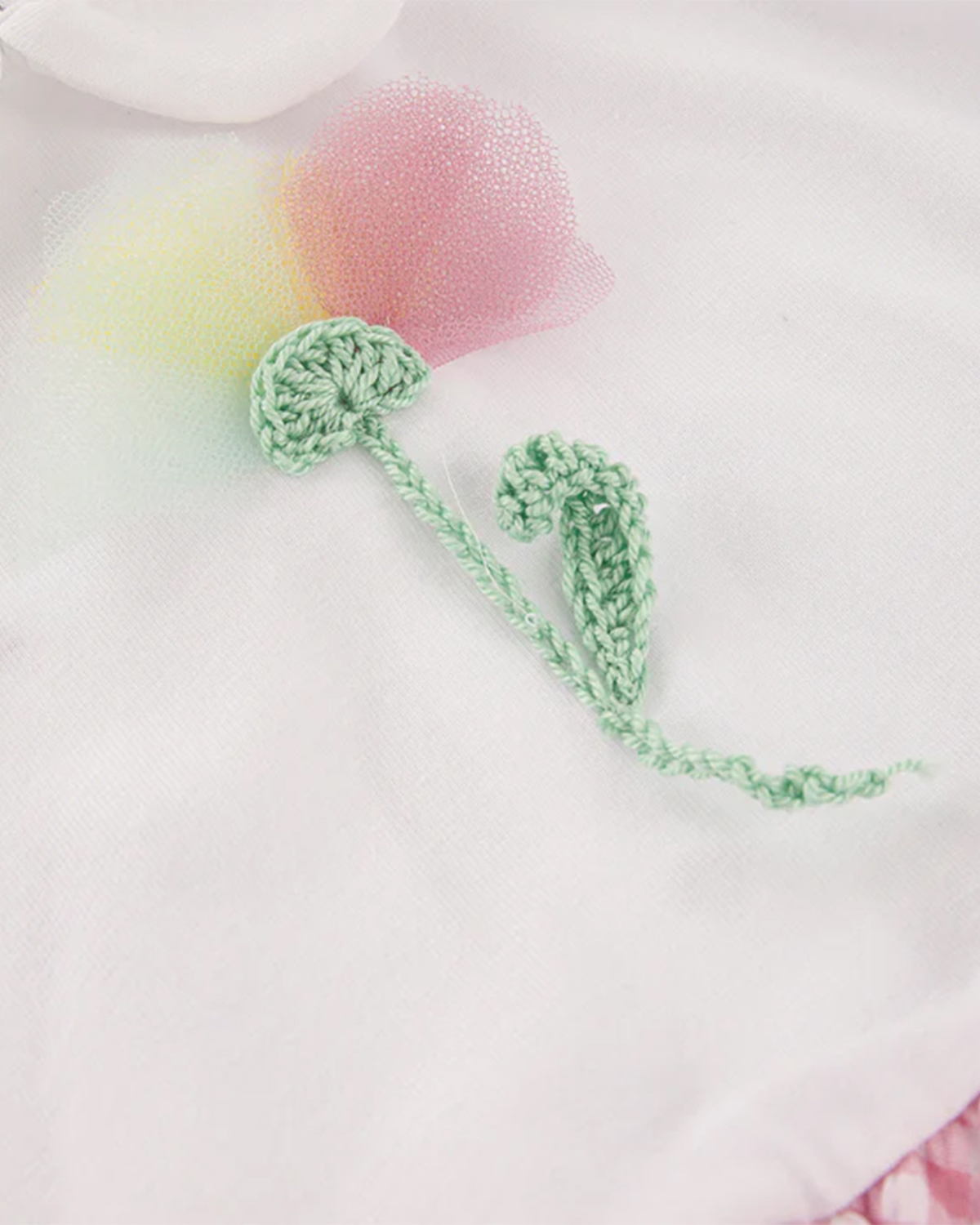 Abito pagliaccetto bianco in cotone stretch a maniche corte con applicazione floreale e gonna in fan...