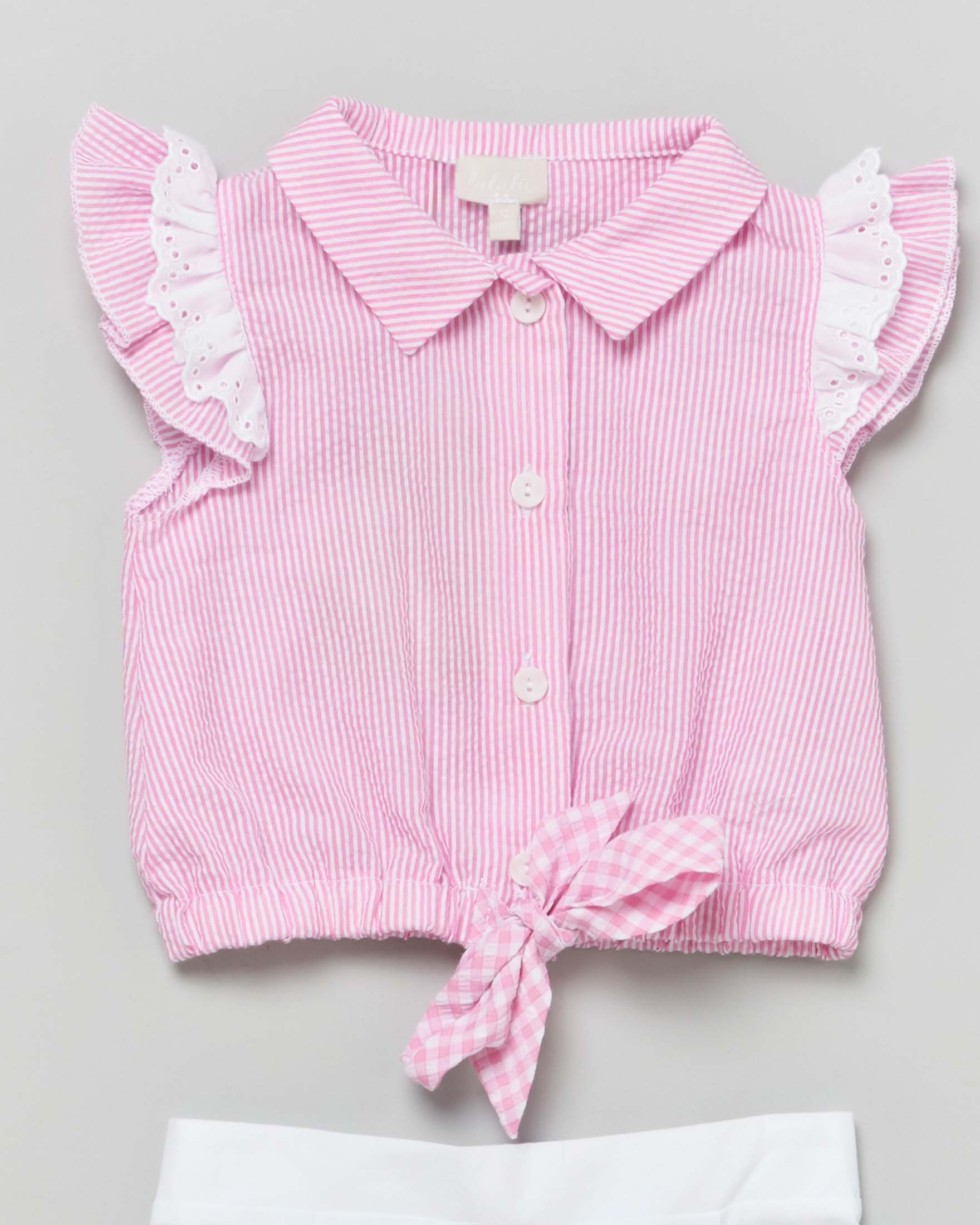 Completo composto da camicetta smanicata a righe rosa e bianche e short bianco