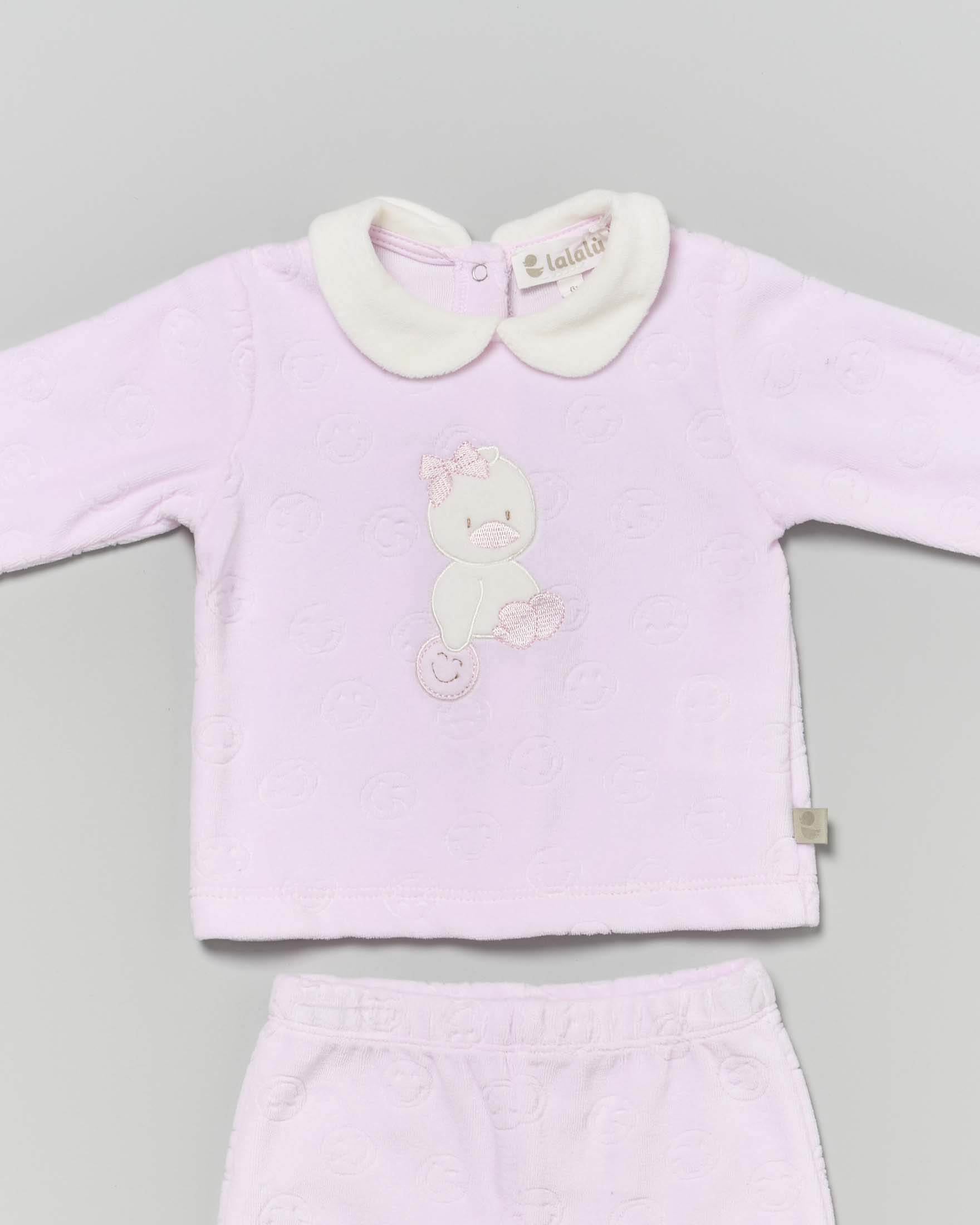 Completo Lalalù rosa in ciniglia con peperella ricamata e smiles soffusi
