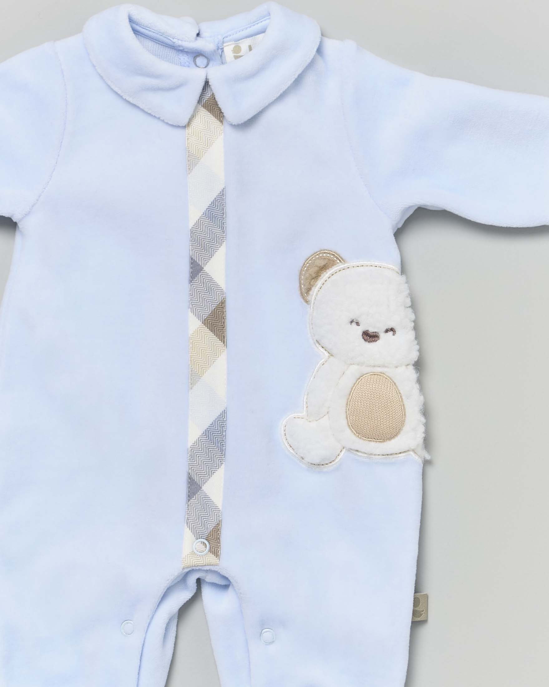 Completo Lalalù azzurro in ciniglia con orsetto ricamato e dettaglio tartan check
