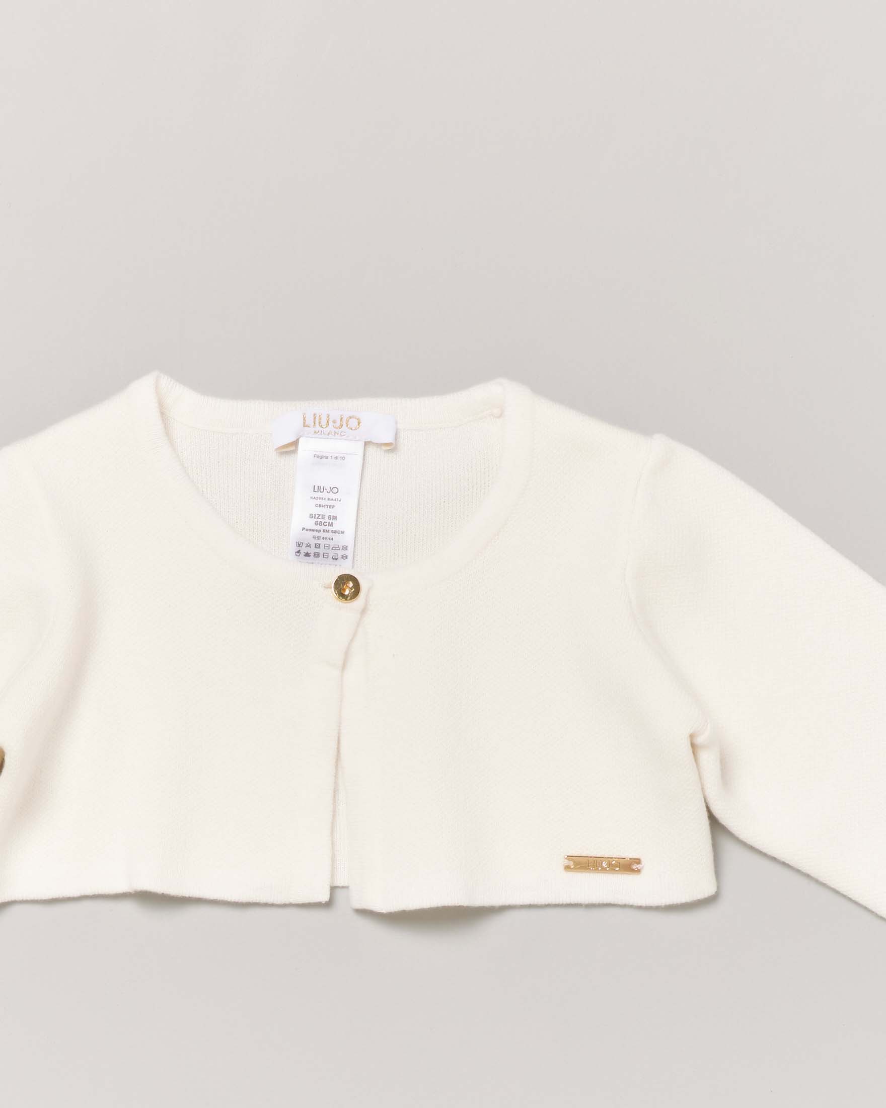 Bolero avorio in maglia di cotone con bottoncino e placchetta porta logo oro 9-48 mesi