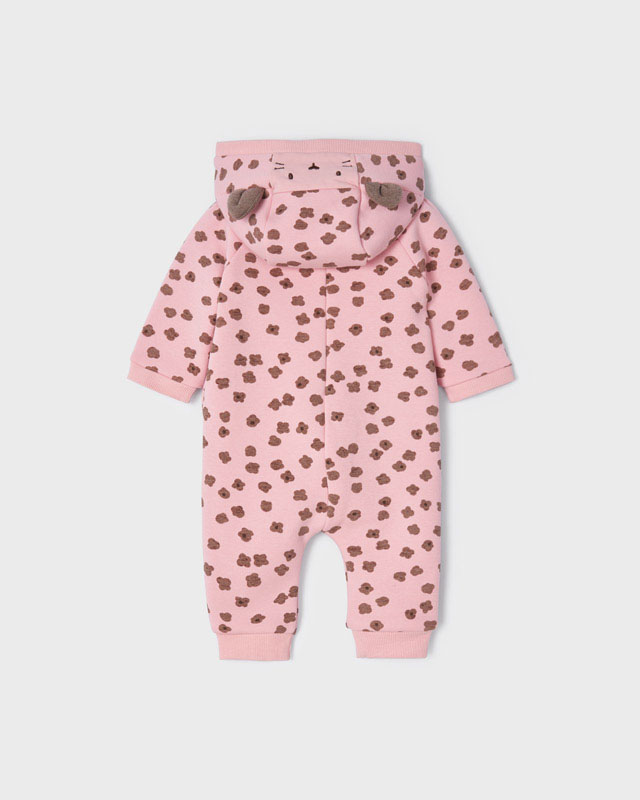 Tutina rosa in fantasia maculata con cappuccio a motivo gattino 2-12 mesi