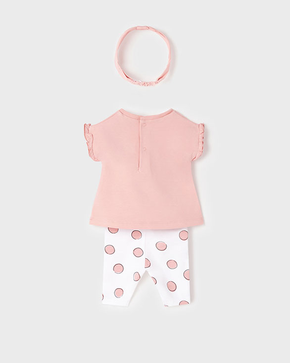 Completo composto da t-shirt rosa con stampa gattini e leggins bianchi con bolli e fascetta rosa abb...