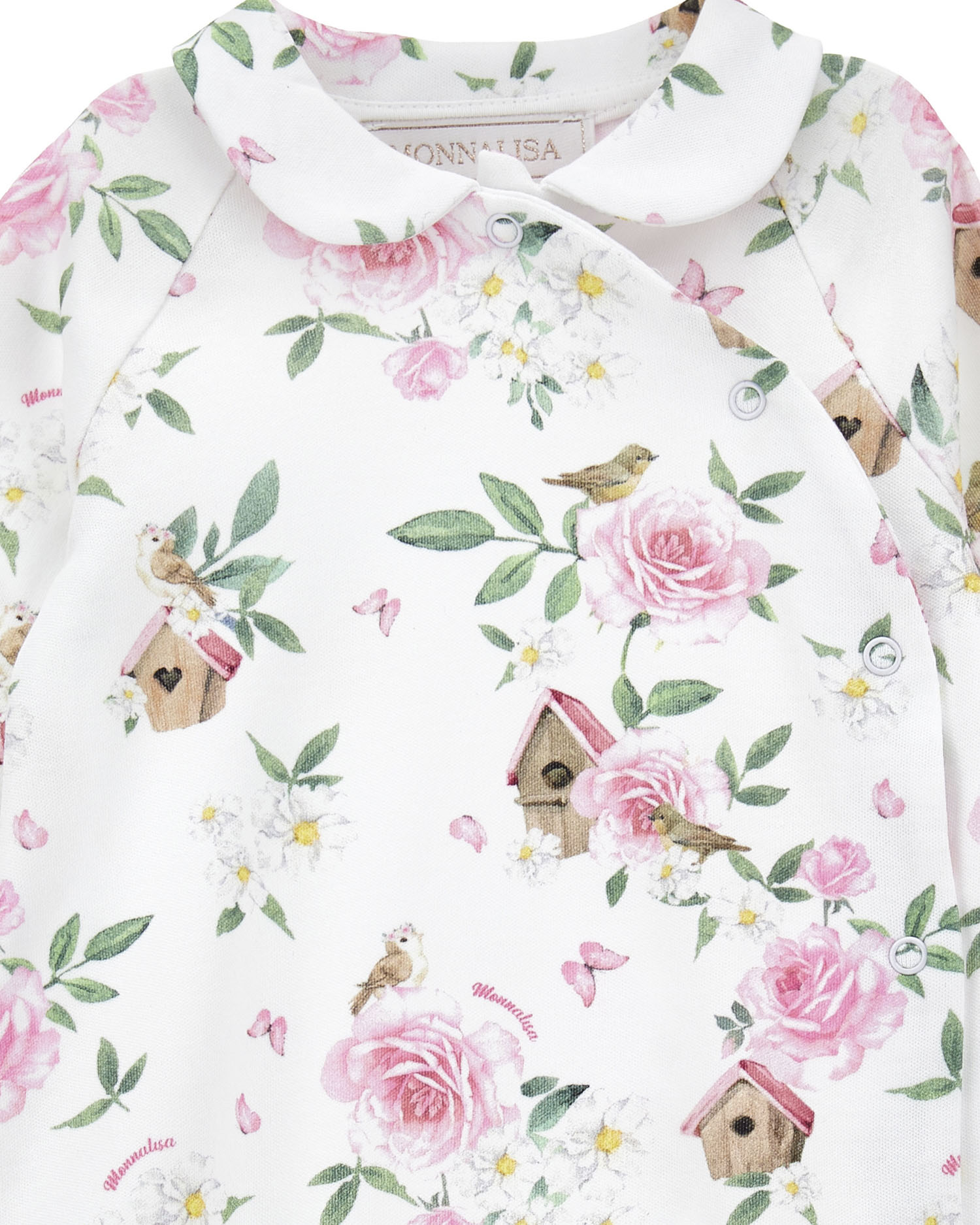 Pagliaccetto bianco in cotone a fantasia floreale rosa e verde con gambaletto e cuffietta abbinata