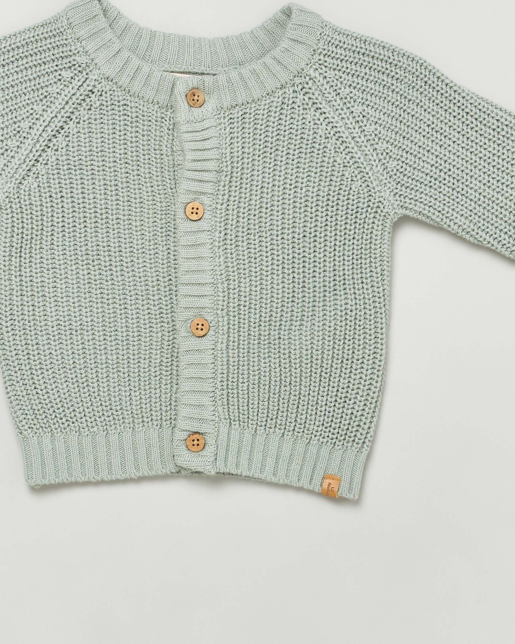 Cardigan salvia in maglia di cotone con bottoncini marroni e manica raglan