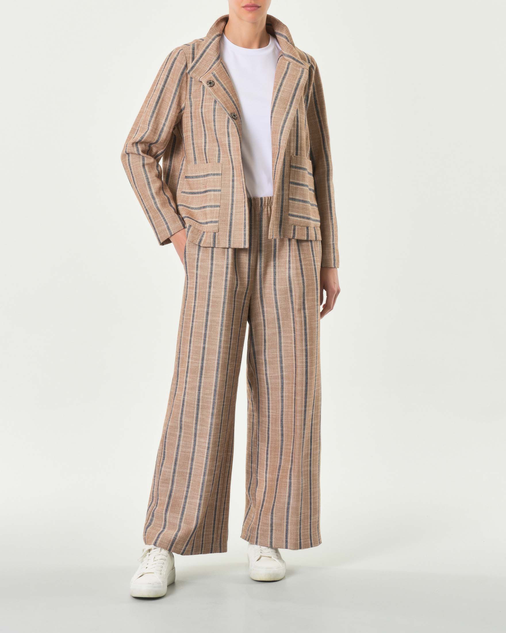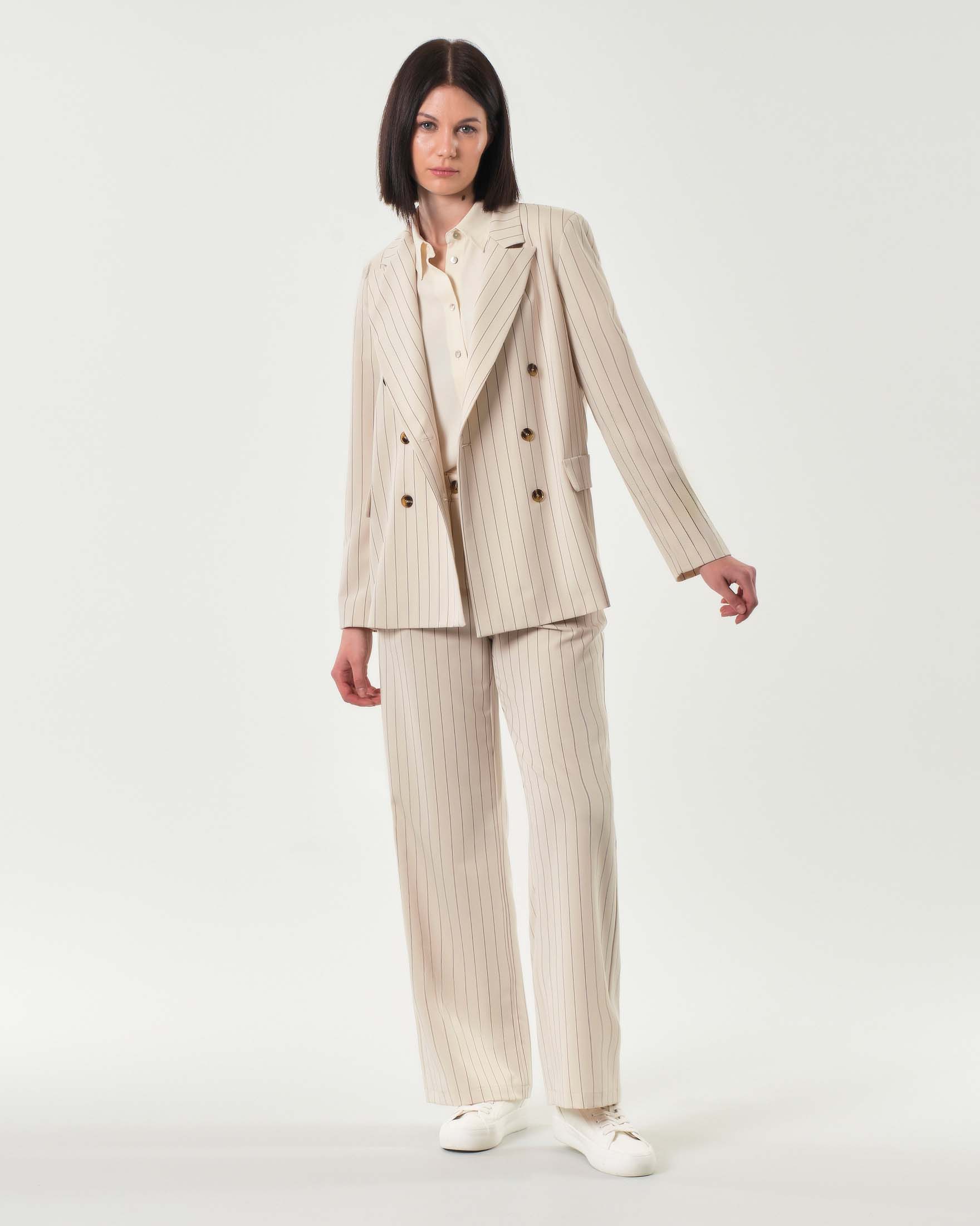 Giacca avorio gessato nero in misto viscosa con scollo a rever e chiusura a doppiopetto