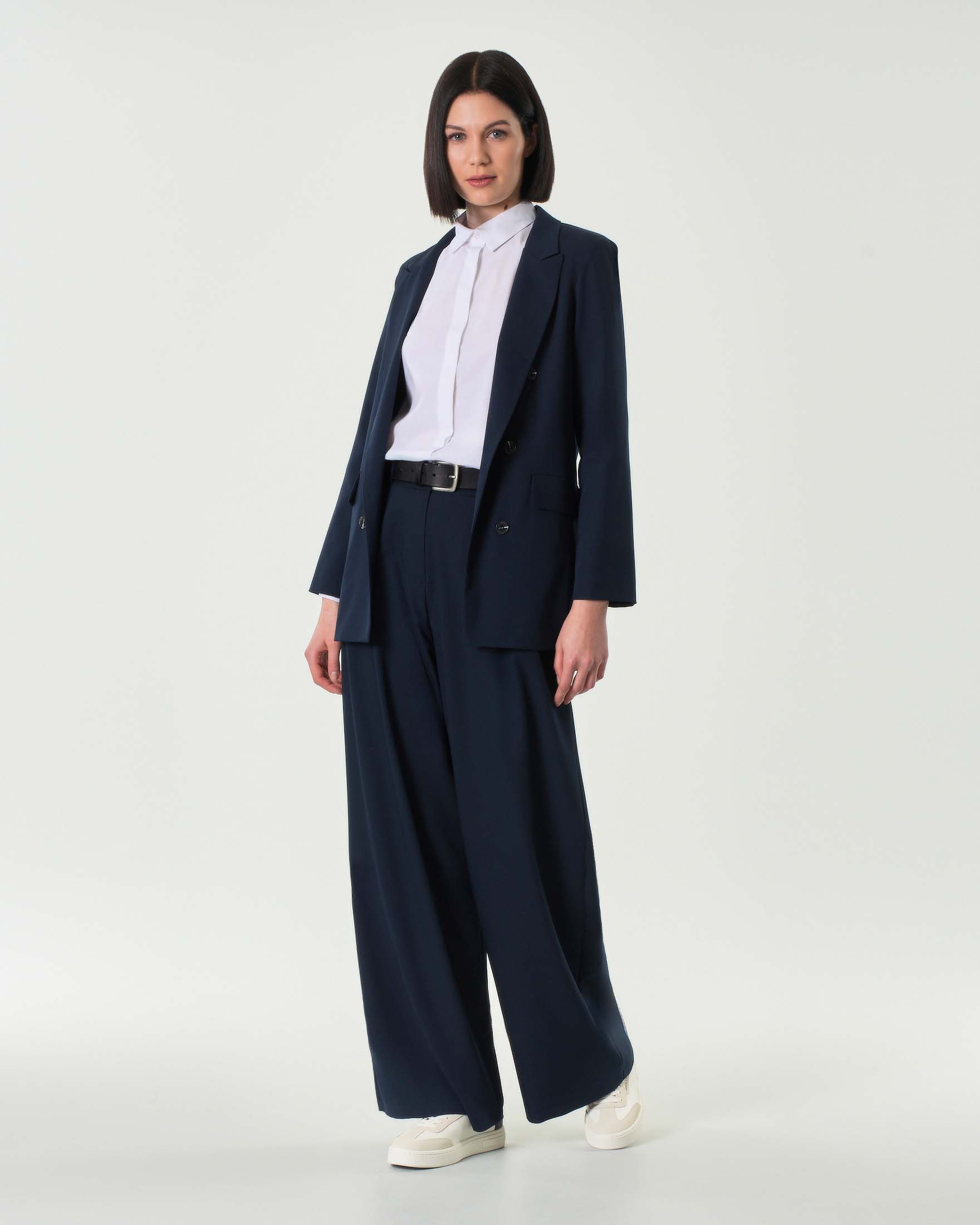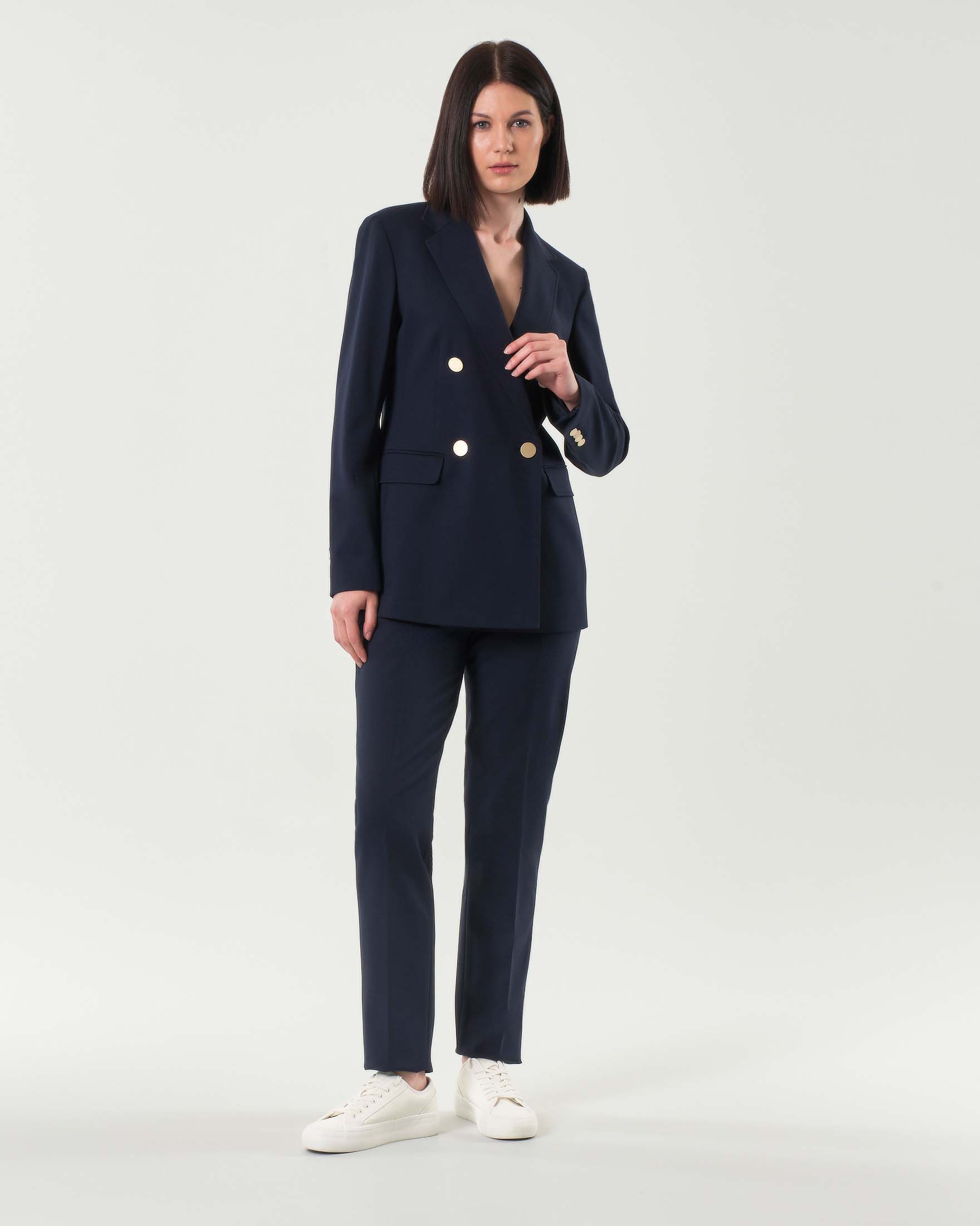 Blazer doppiopetto blu in jersey punto Milano con bottoni a specchio color oro