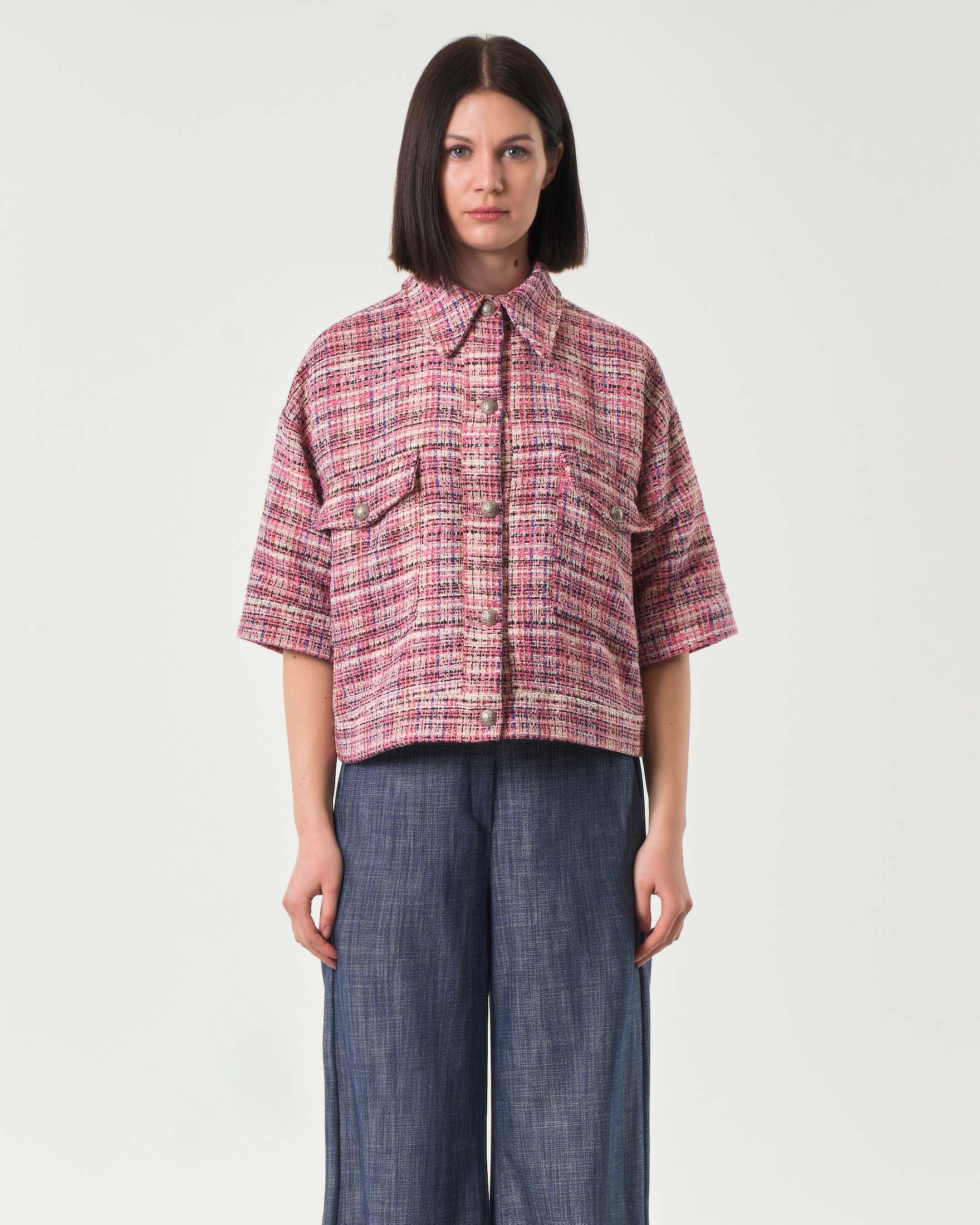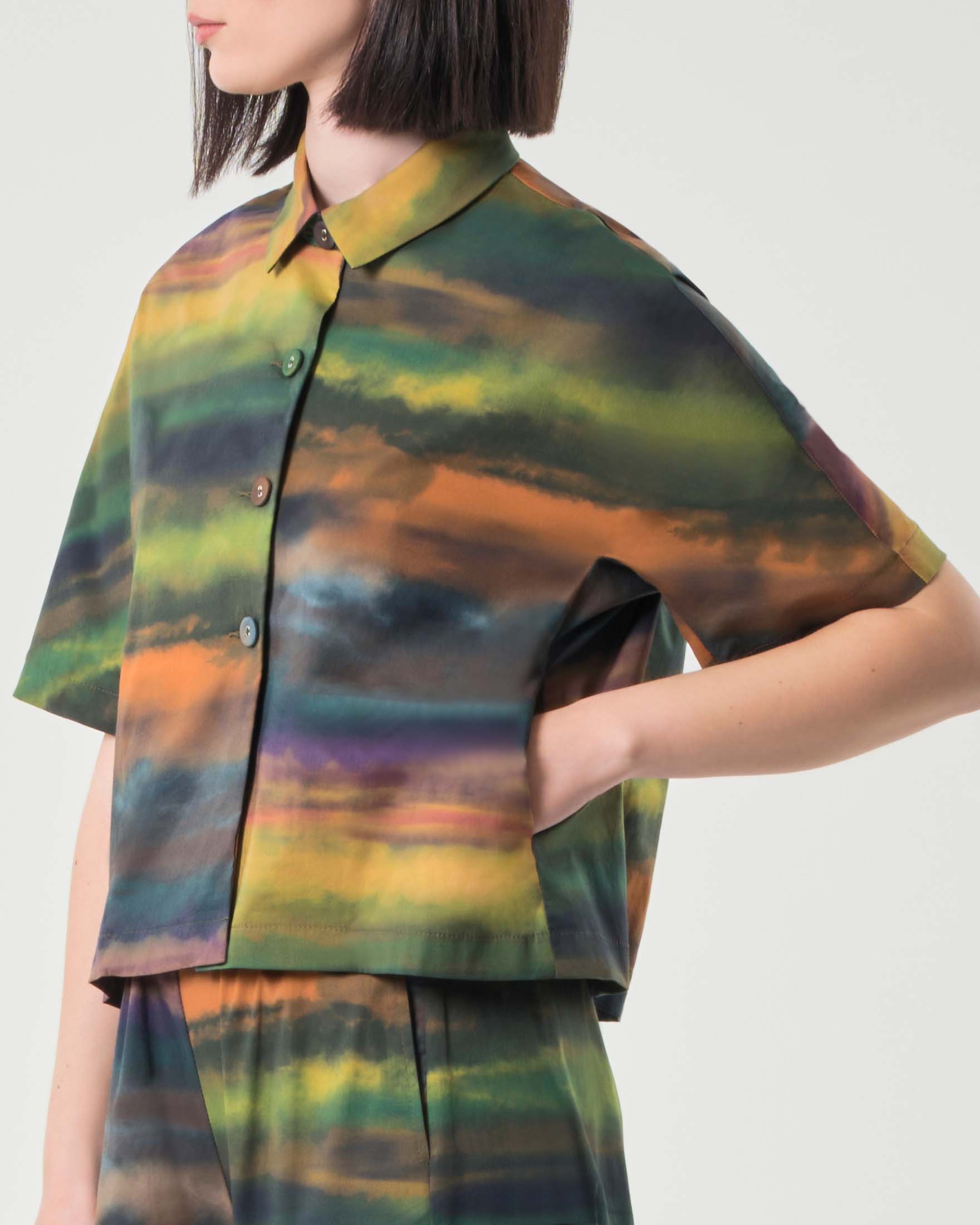 Giacca a camicia in popeline di cotone a sfumature multicoloree con maniche corte