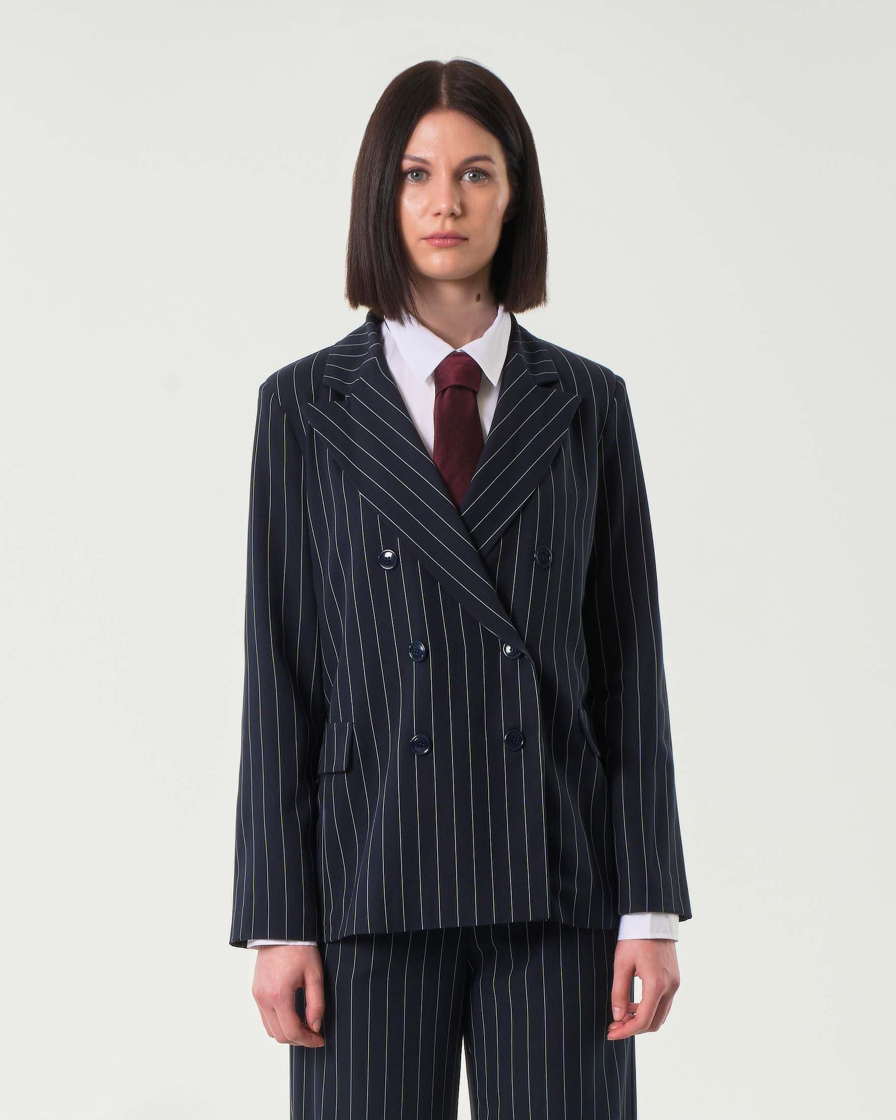 Giacca blu gessato bianco in misto viscosa con scollo a rever e chiusura a doppiopetto
